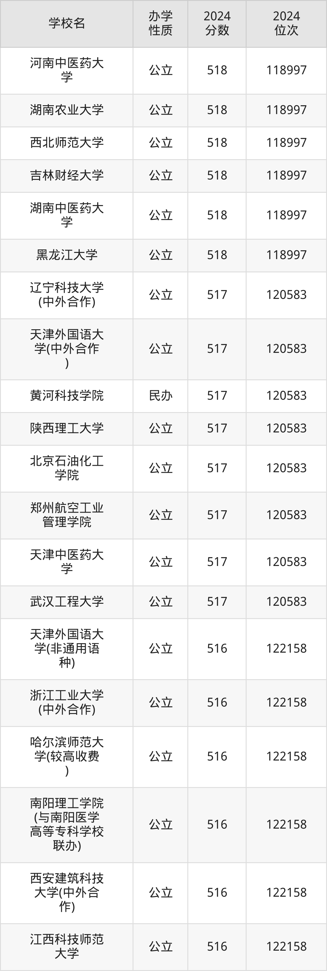 | 天津外国语大 学(中外合作 ) | 517 | 120583 |