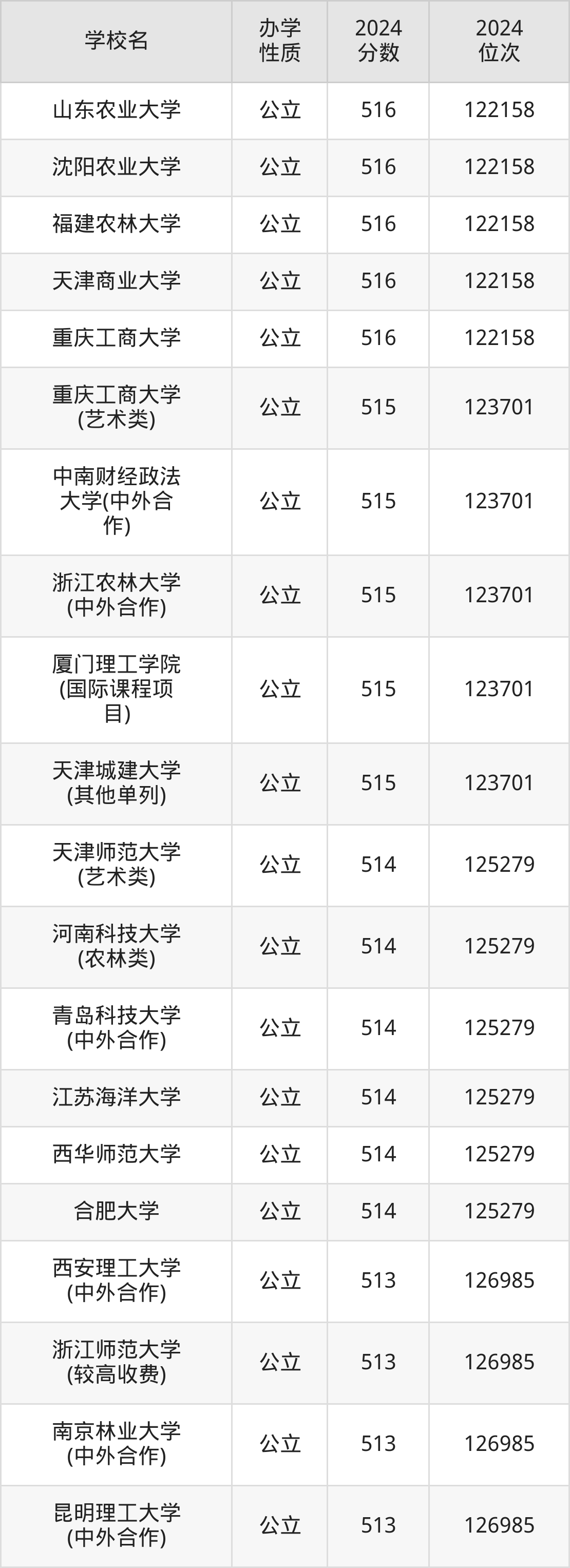 | 山东农业大学 | 516 | 122158 |