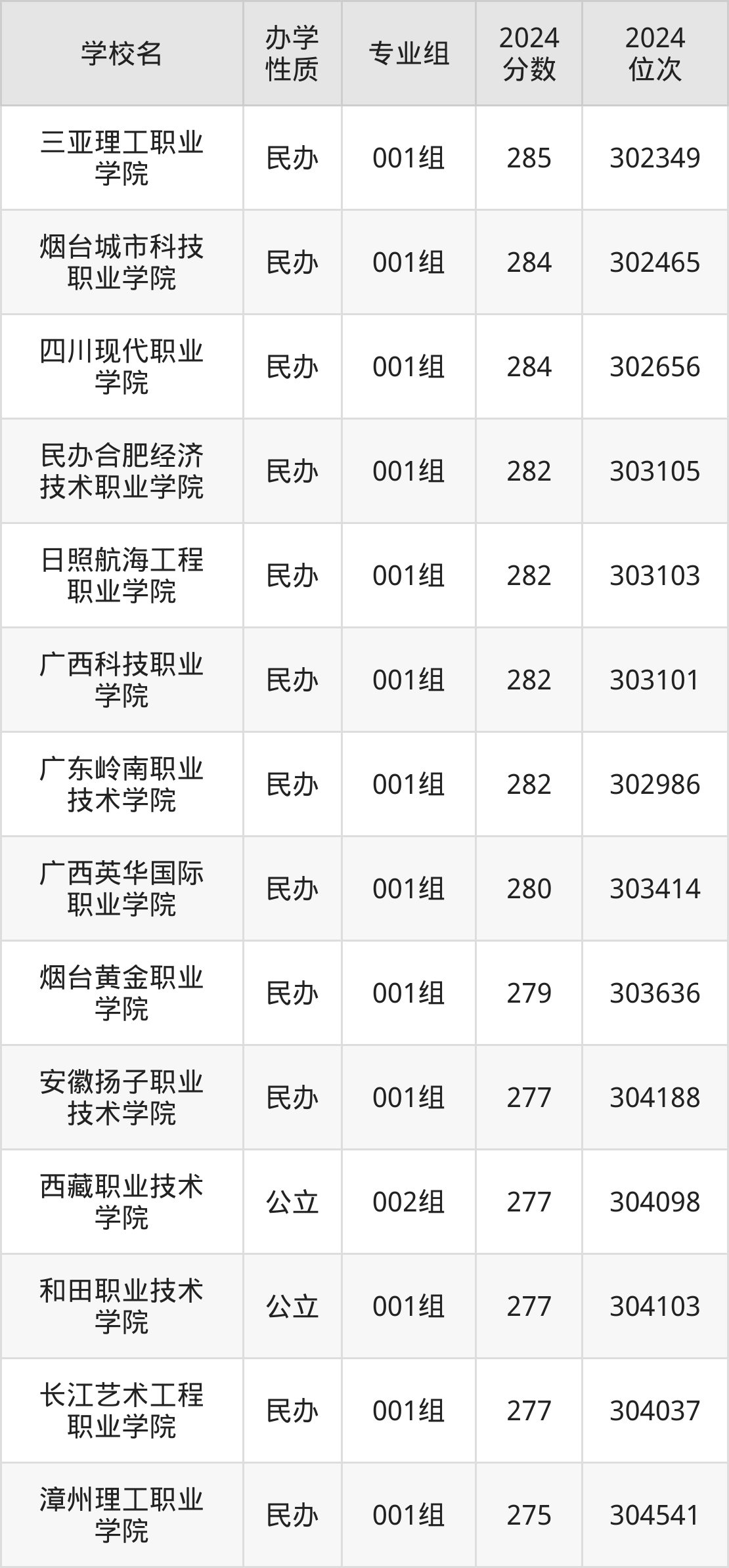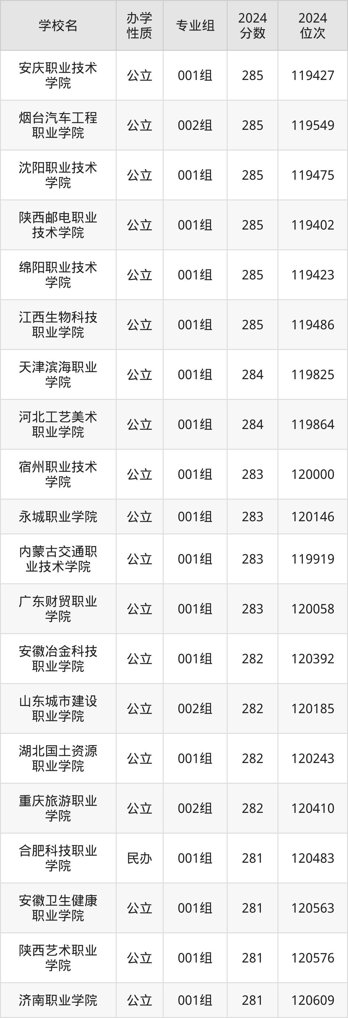 | 民办合肥经济 技术职业学院 | 001组 | 282 | 303105 |