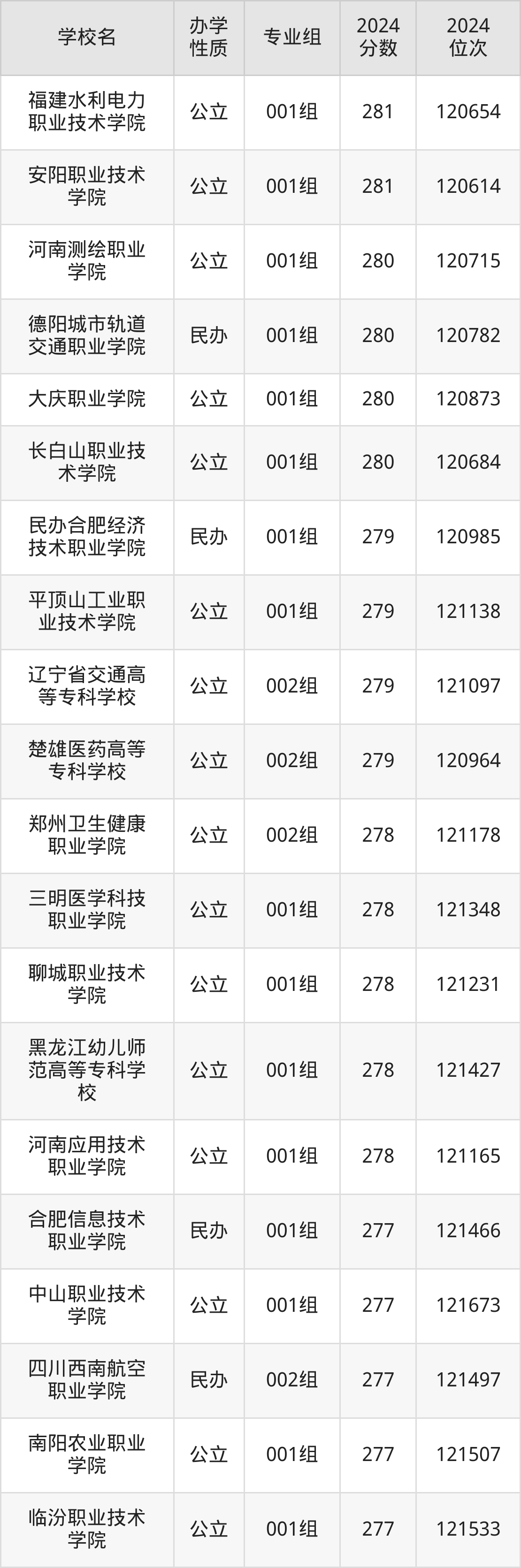 | 辽宁省交通高 等专科学校 | 002组 | 279 | 121097 |