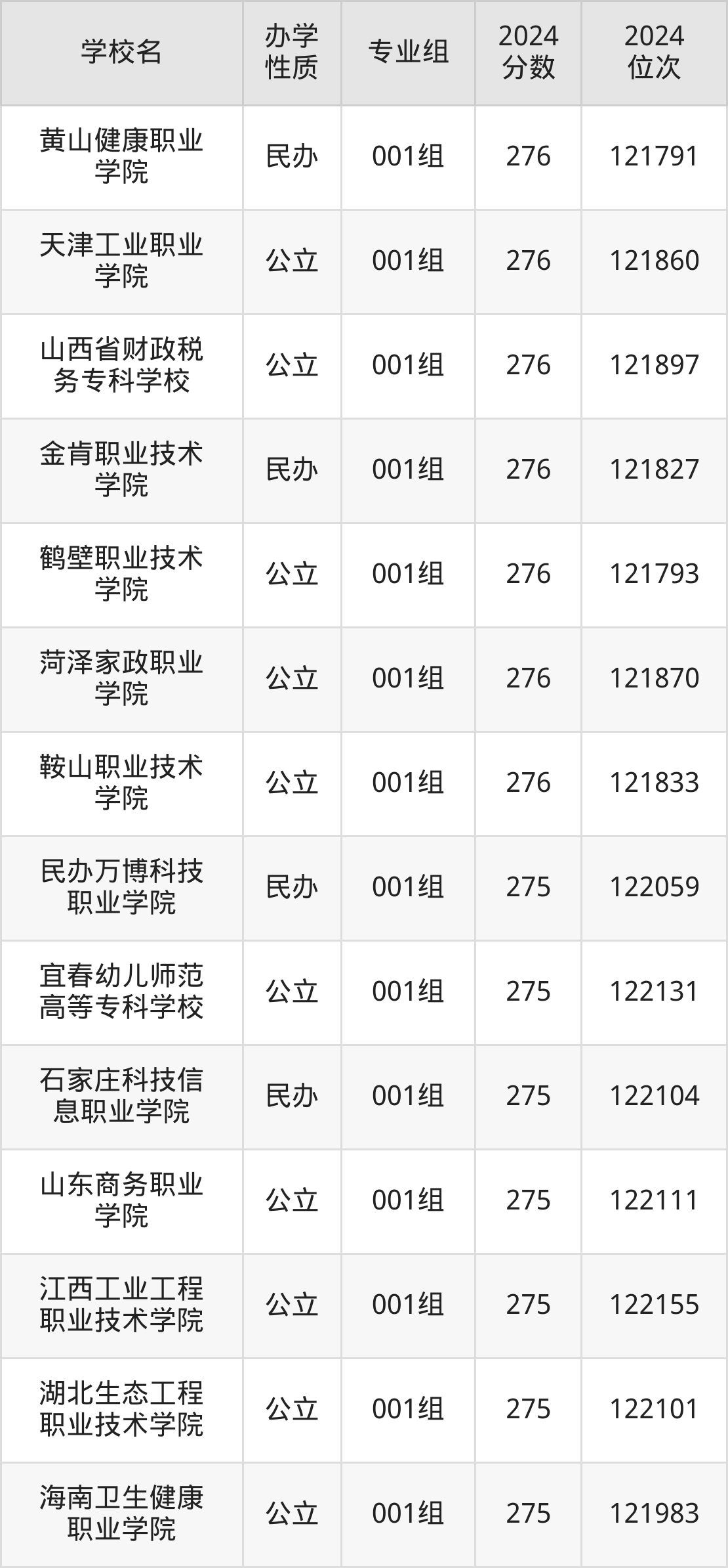 | 湖北生态工程 职业技术学院 | 001组 | 275 | 122101 |
