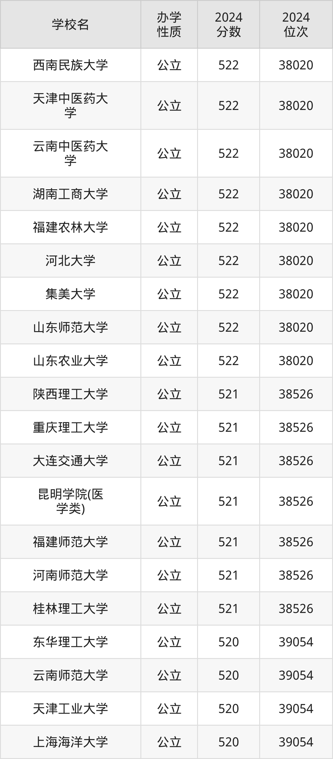 2024年云南理科517分考生能上西南民族大学、天津中医药大学、云南中医药大学、湖南工商大学、福建农林大学等36所一本院校,具体录取分数线及位次为: