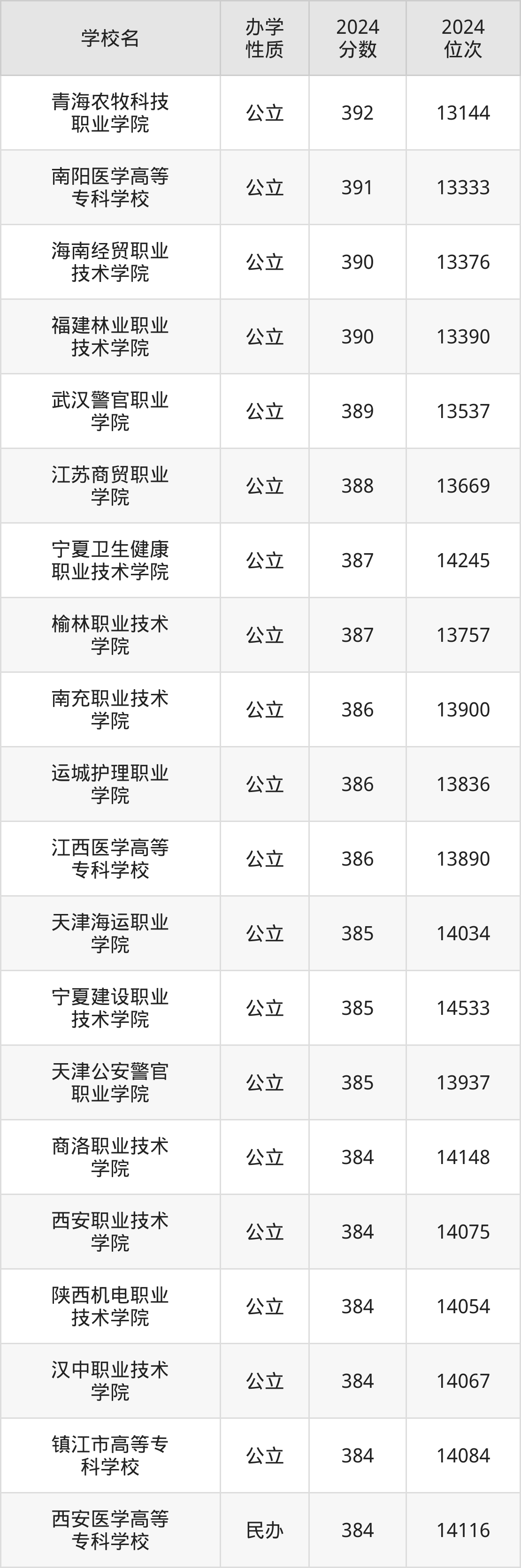 2024年宁夏文科387分考生能上青海农牧科技职业学院、南阳医学高等专科学校、海南经贸职业技术学院、福建林业职业技术学院、武汉警官职业学院等27所专科院校,具体录取分数线及位次为: