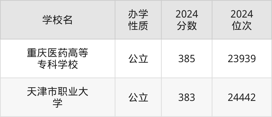 2024年宁夏理科387分考生能上重庆医药高等专科学校、天津市职业大学2所专科院校,具体录取分数线及位次为: