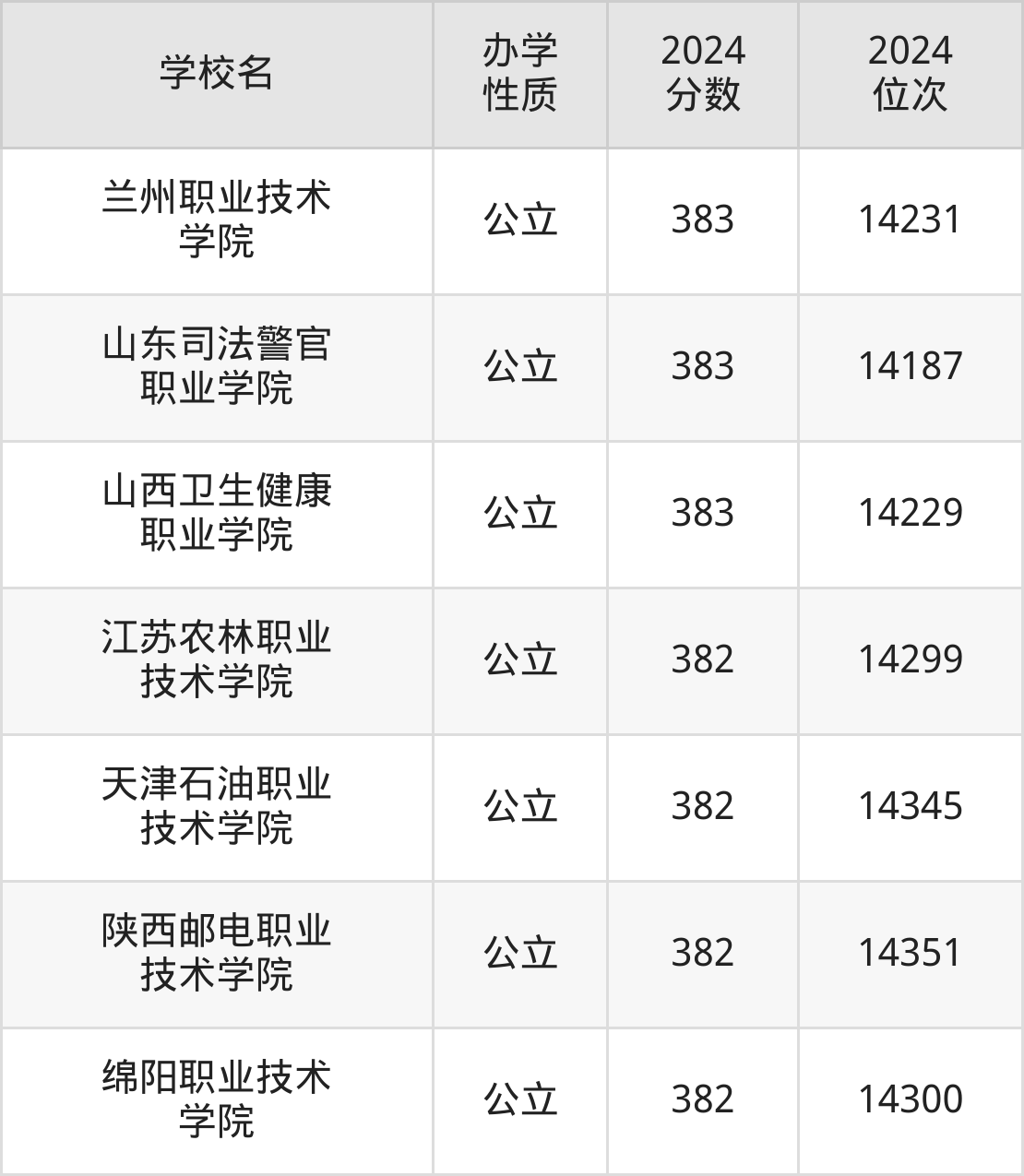 | 绵阳职业技术 学院 | 382 | 14300 |