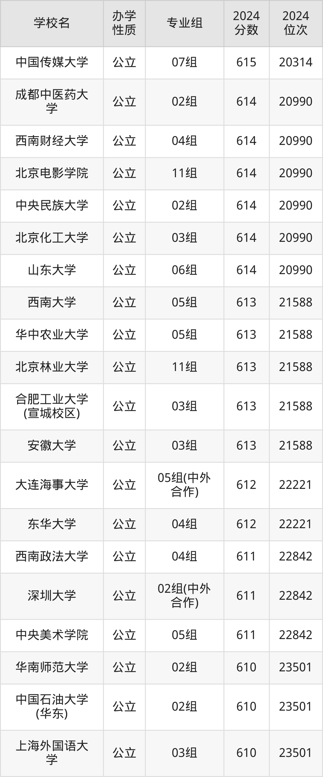 江苏615分左右的考生可以上重庆大学、四川大学、北京外国语大学等院校,刚好在615分的院校有华东政法大学。