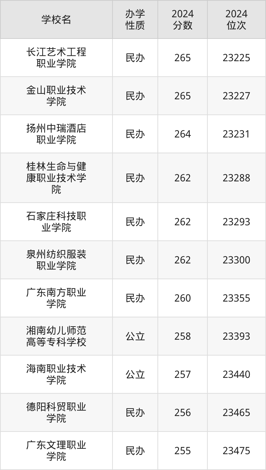 2024年宁夏文科260分考生能上长江艺术工程职业学院、金山职业技术学院、扬州中瑞酒店职业学院、桂林生命与健康职业技术学院、石家庄科技职业学院等11所专科院校,具体录取分数线及位次为:
