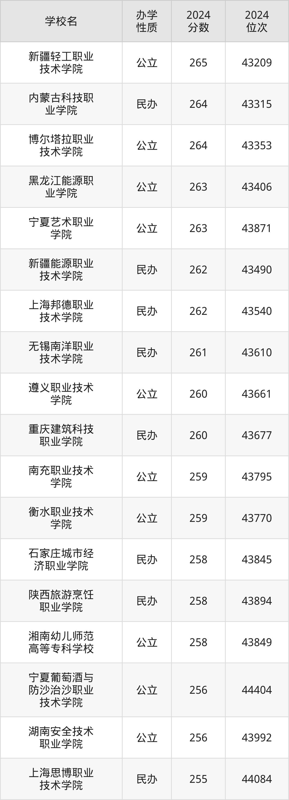 2024年宁夏理科260分考生能上新疆轻工职业技术学院、内蒙古科技职业学院、博尔塔拉职业技术学院、黑龙江能源职业学院、宁夏艺术职业学院等18所专科院校,具体录取分数线及位次为: