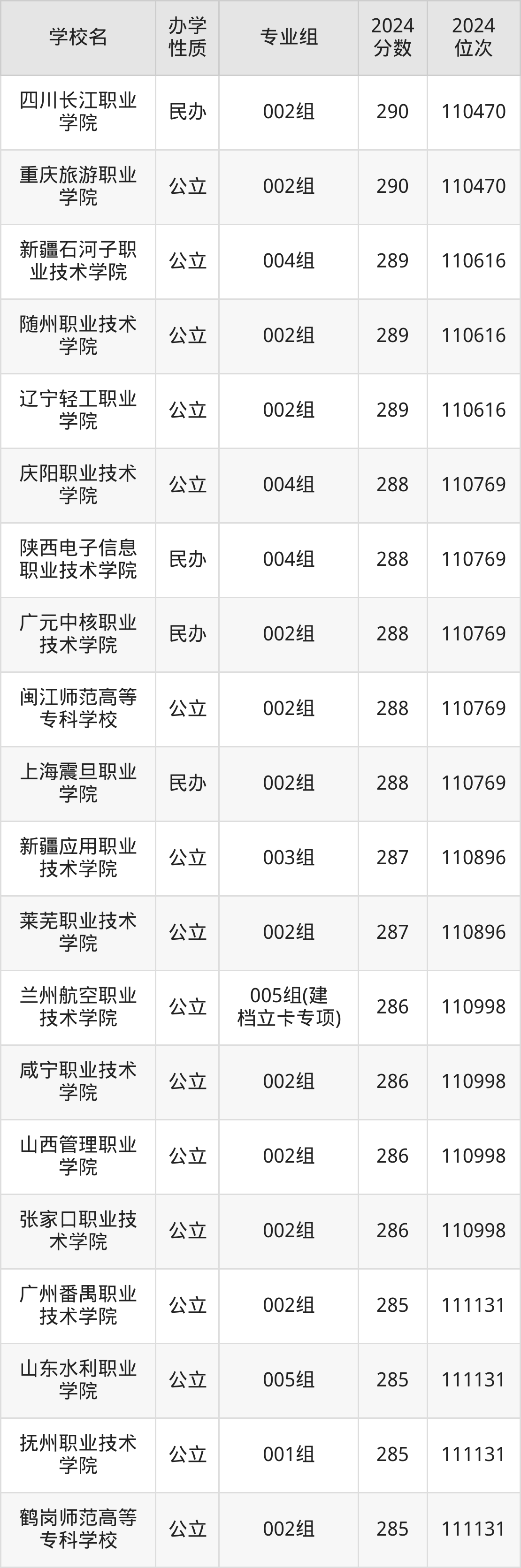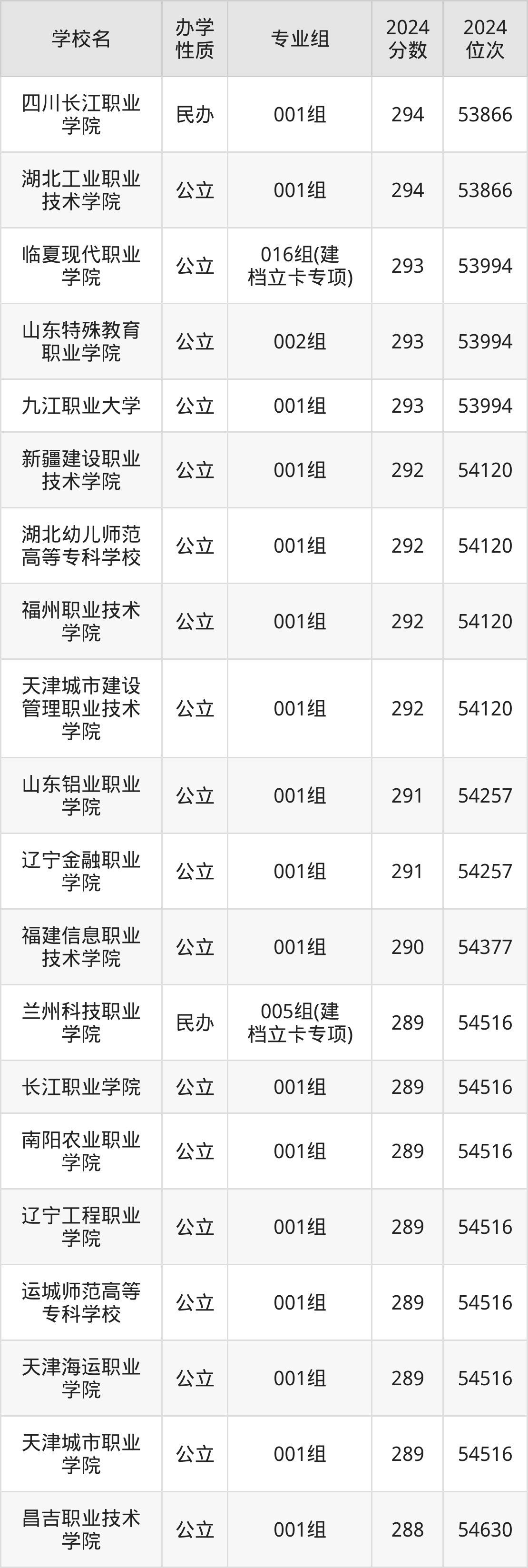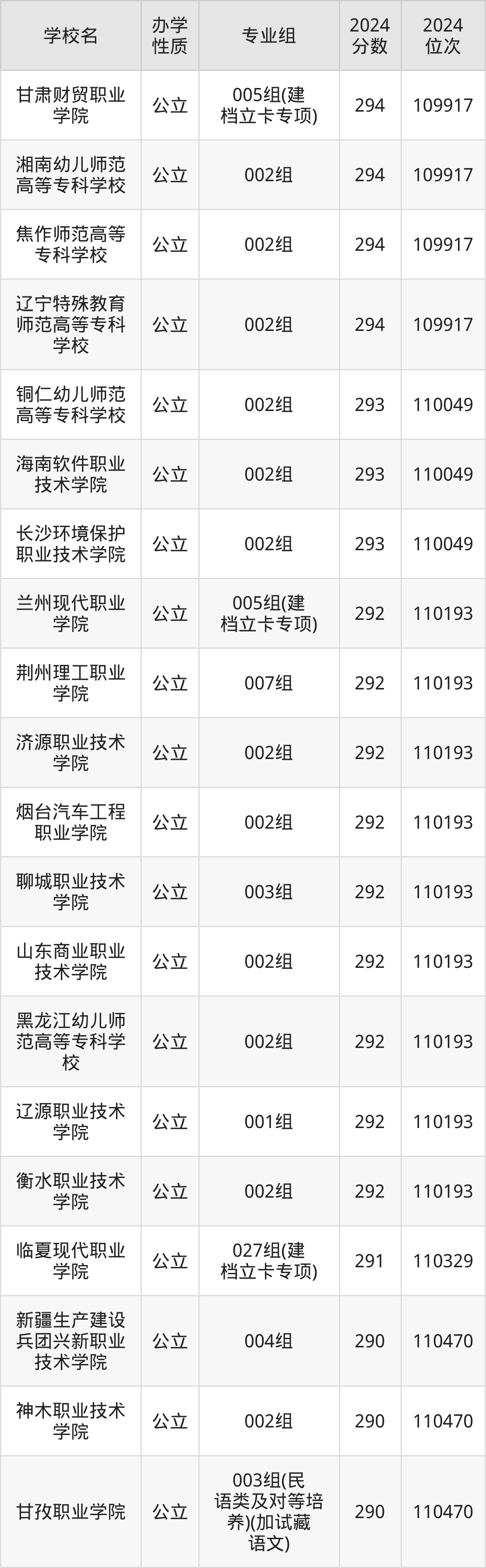2024年甘肃历史类289分考生能上四川长江职业学院、湖北工业职业技术学院、临夏现代职业学院、山东特殊教育职业学院、九江职业大学等36所专科院校,具体录取分数线及位次为: