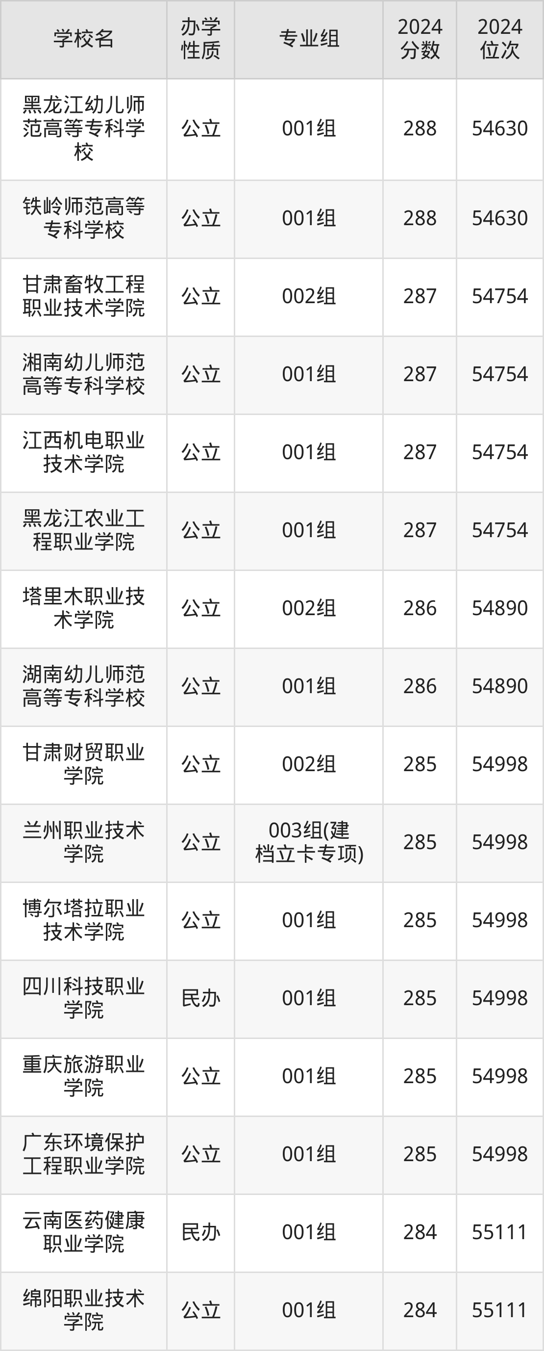 2024年甘肃物理类289分考生能上甘肃财贸职业学院、湘南幼儿师范高等专科学校、焦作师范高等专科学校、辽宁特殊教育师范高等专科学校、铜仁幼儿师范高等专科学校等44所专科院校,具体录取分数线及位次为: