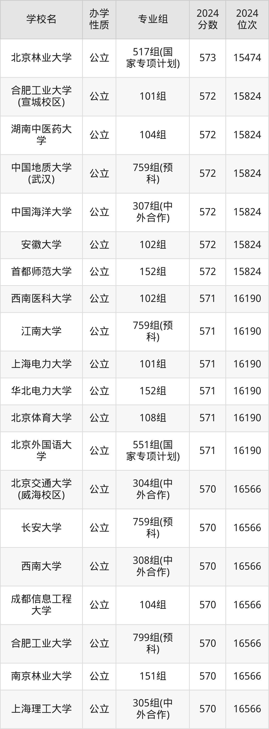 | 北京林业大学 | 517组(国 家专项计划) | 573 | 15474 |