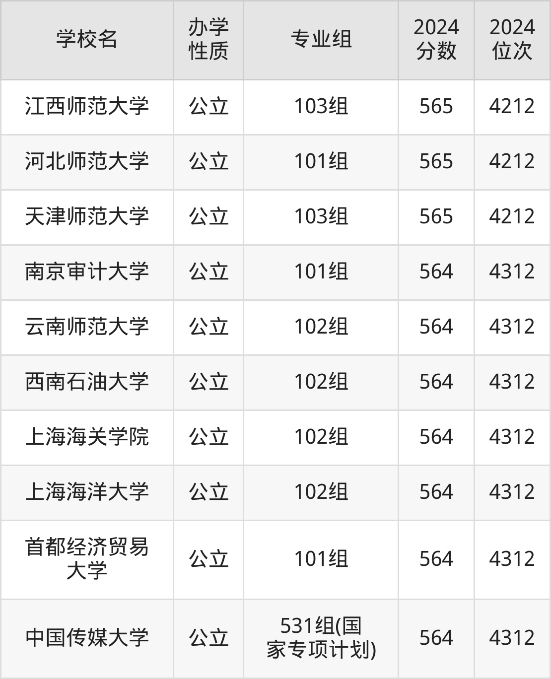 | 中国传媒大学 | 531组(国 家专项计划) | 564 | 4312 |