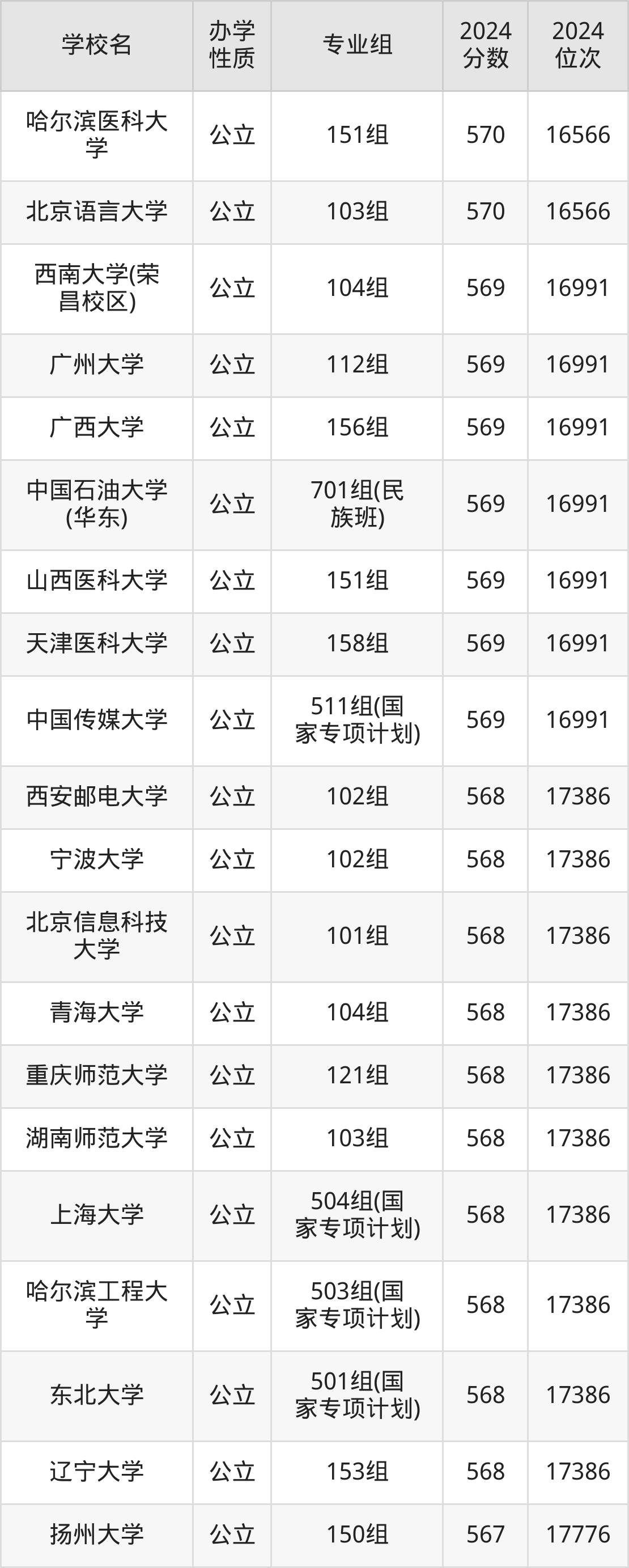 | 中国传媒大学 | 511组(国 家专项计划) | 569 | 16991 |