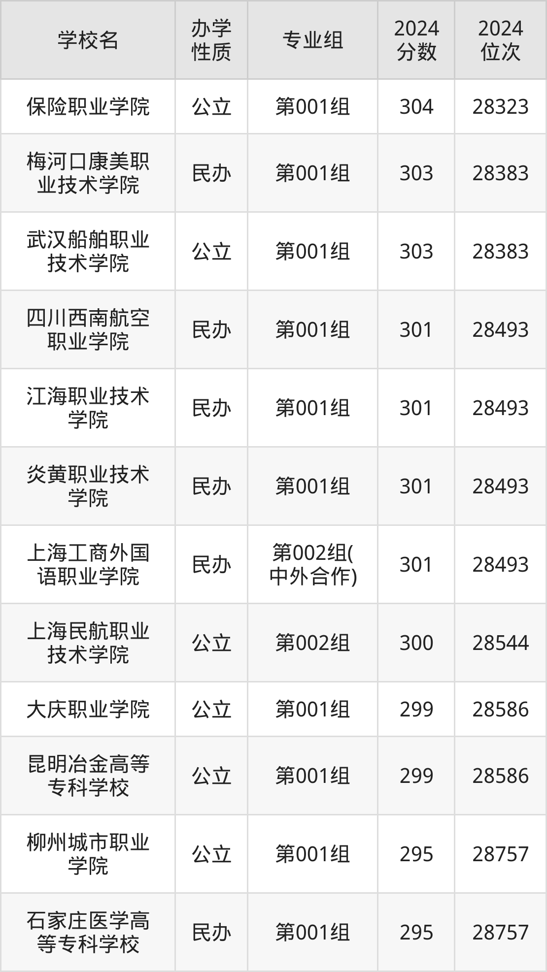 2024年吉林历史类300分考生能上保险职业学院、梅河口康美职业技术学院、四川西南航空职业学院、江海职业技术学院、炎黄职业技术学院等11所专科院校,具体录取分数线及位次为: