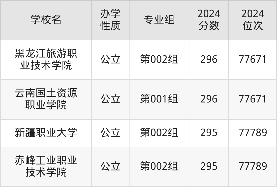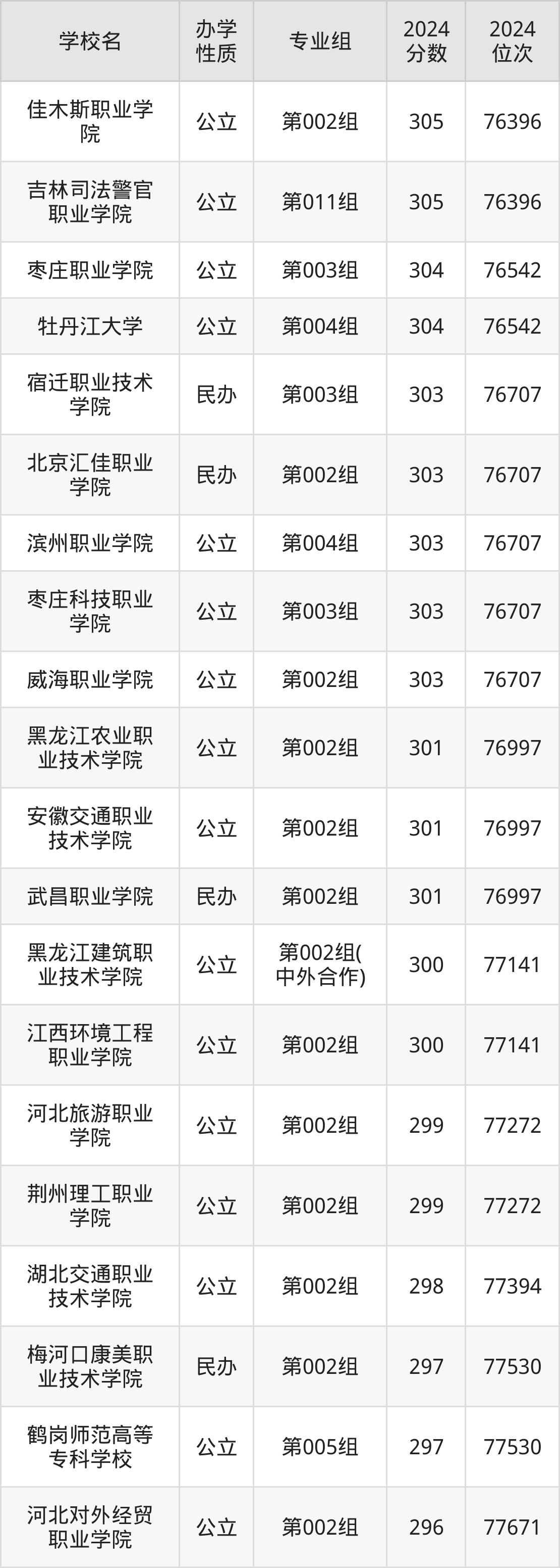 2024年吉林物理类300分考生能上佳木斯职业学院、吉林司法警官职业学院、枣庄职业学院、牡丹江大学、宿迁职业技术学院等20所专科院校,具体录取分数线及位次为: