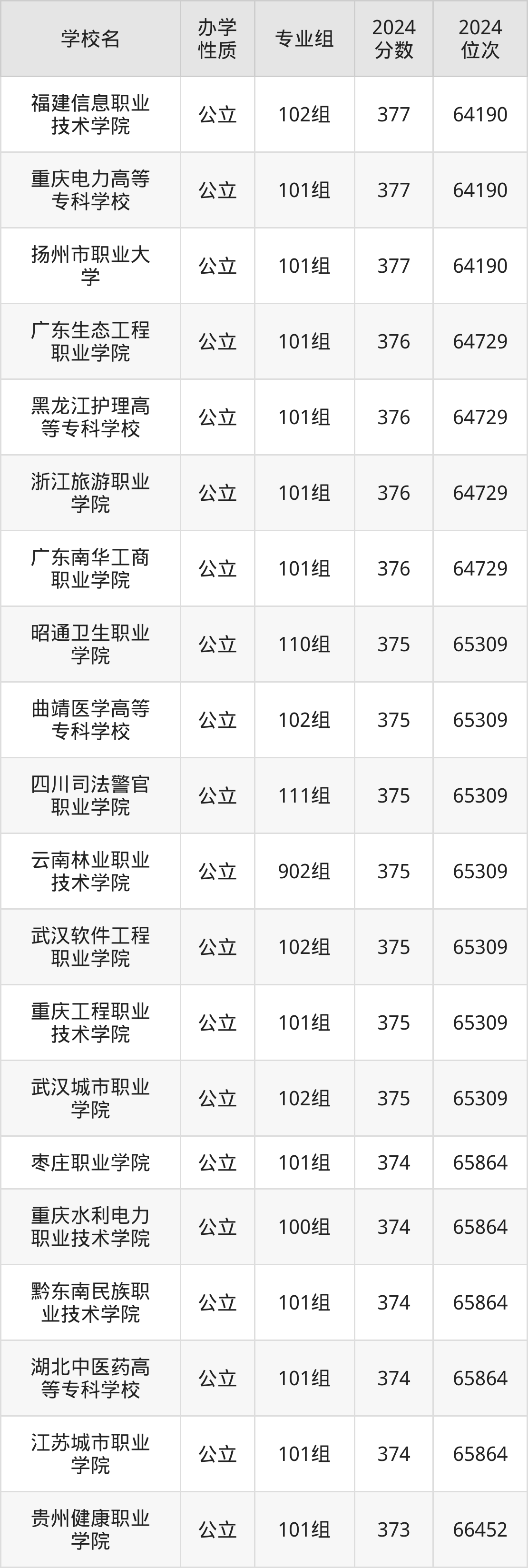 | 重庆电力高等 专科学校 | 101组 | 377 | 64190 |
