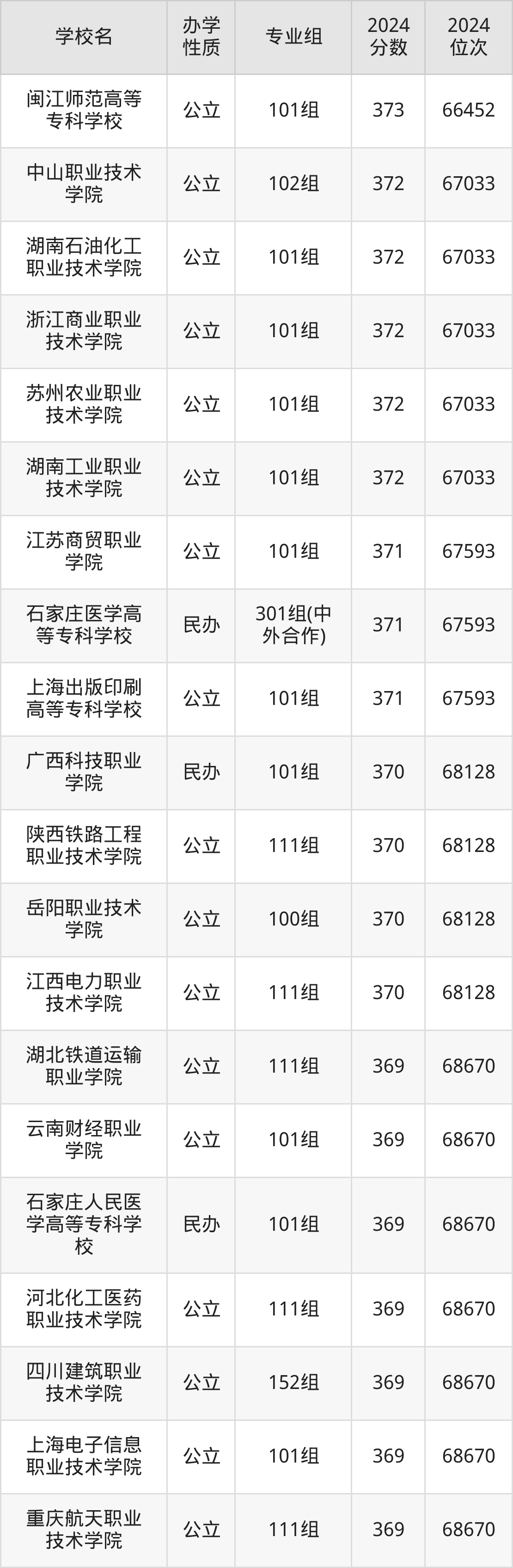 | 石家庄医学高 等专科学校 | 301组(中 外合作) | 371 | 67593 |