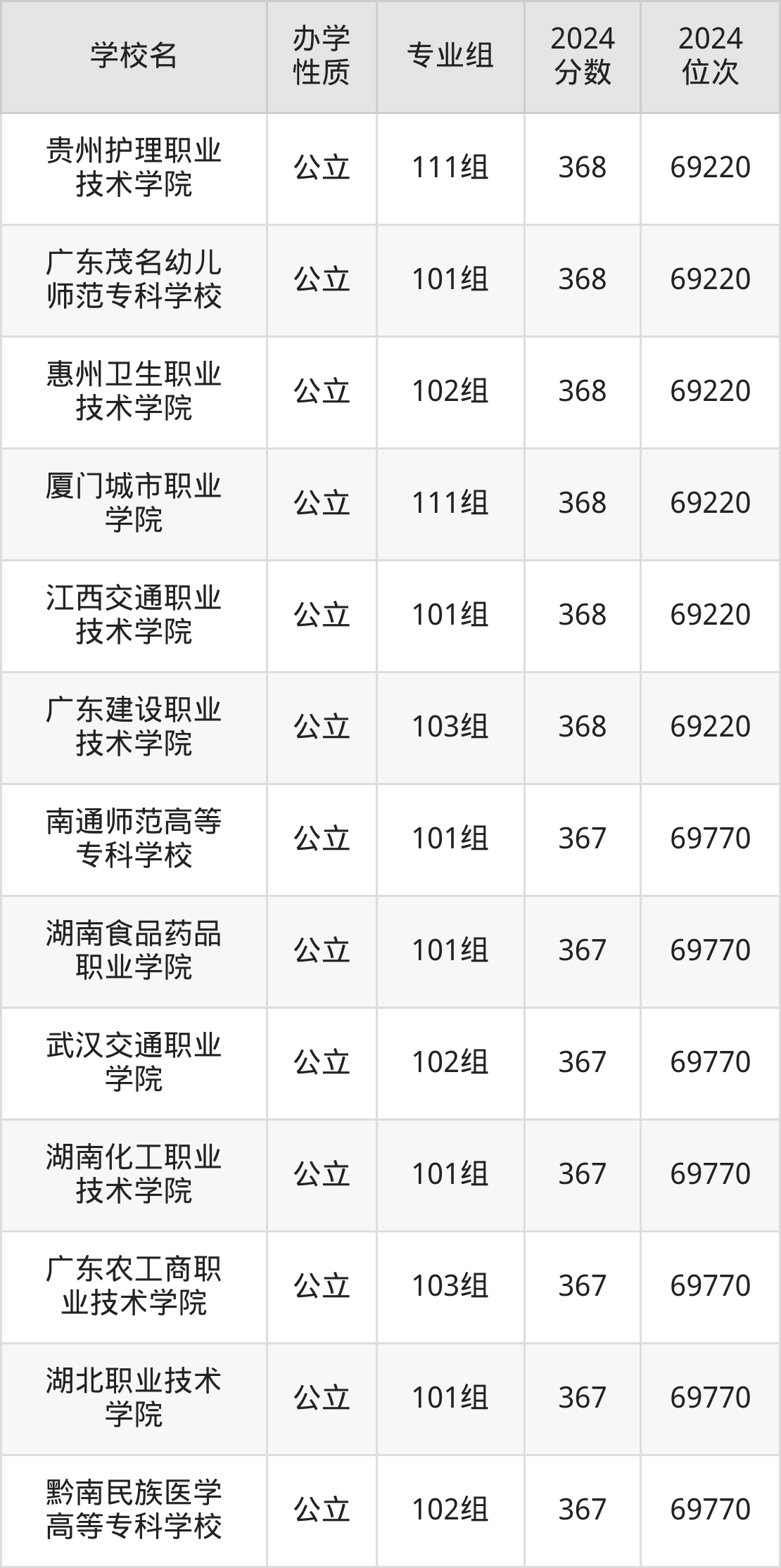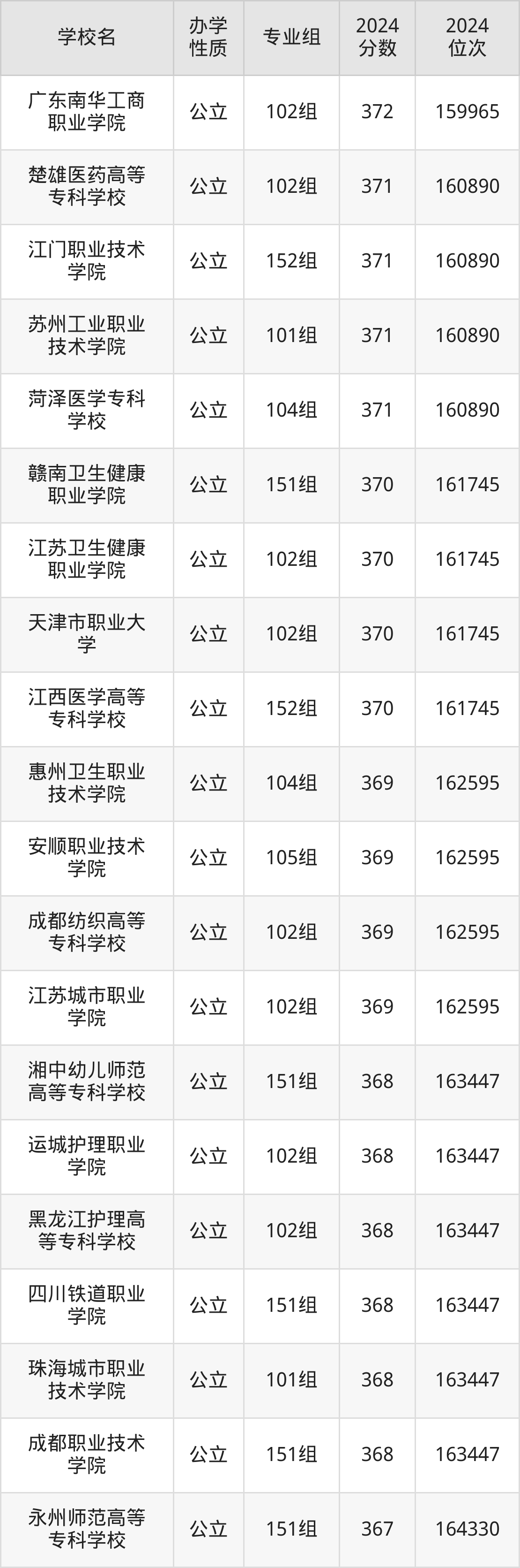 | 赣南卫生健康 职业学院 | 151组 | 370 | 161745 |
