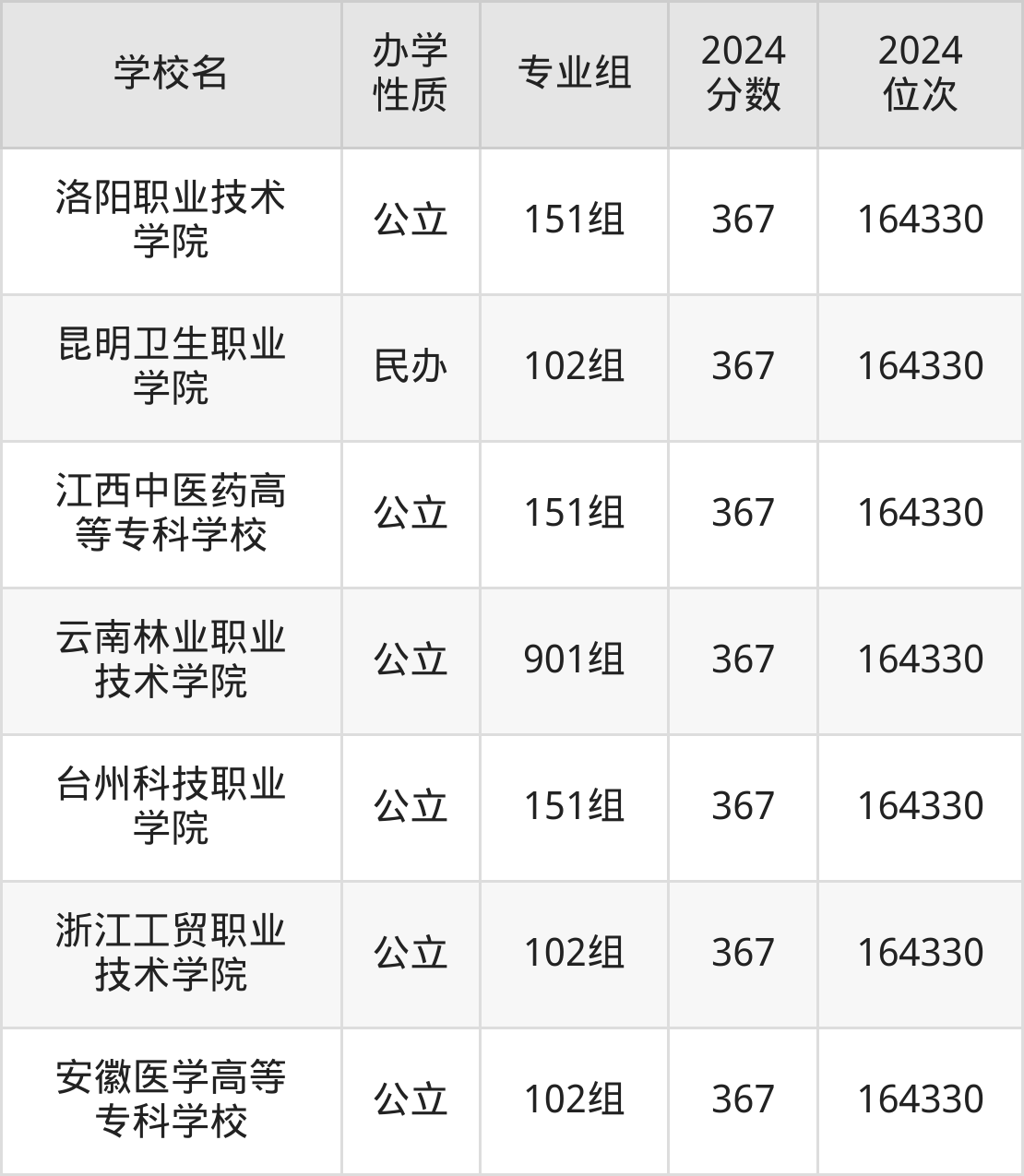 | 昆明卫生职业 学院 | 102组 | 367 | 164330 |