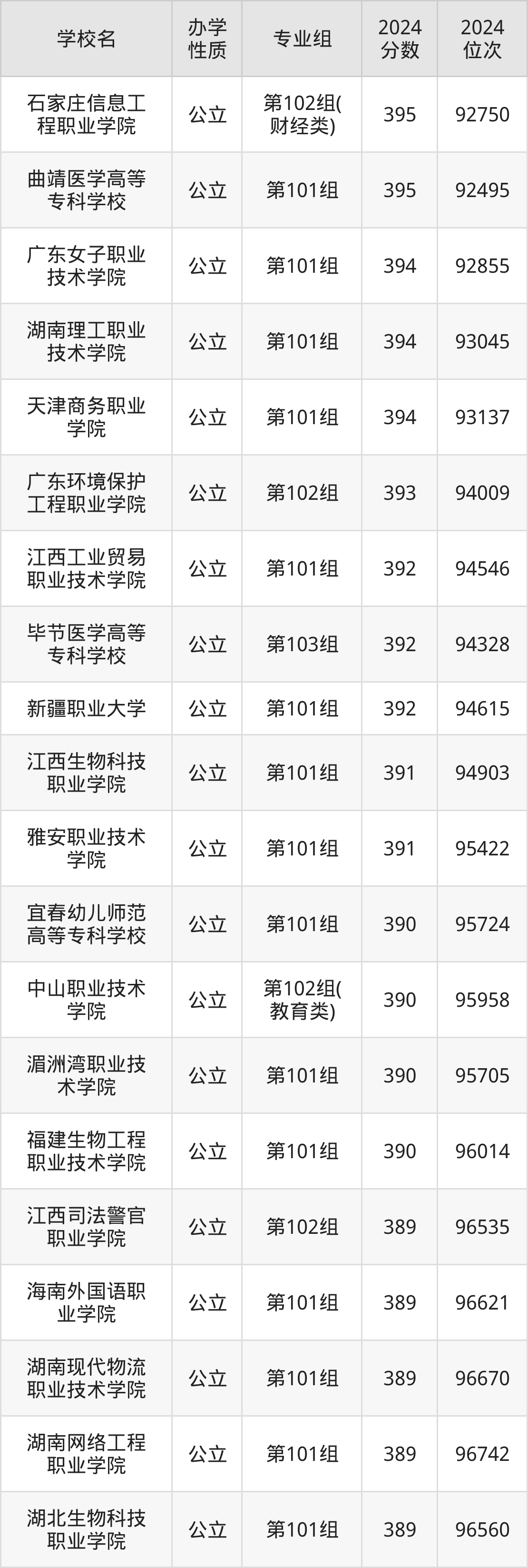 2024年江西历史类390分考生能上石家庄信息工程职业学院、曲靖医学高等专科学校、广东女子职业技术学院、湖南理工职业技术学院、天津商务职业学院等36所专科院校,具体录取分数线及位次为: