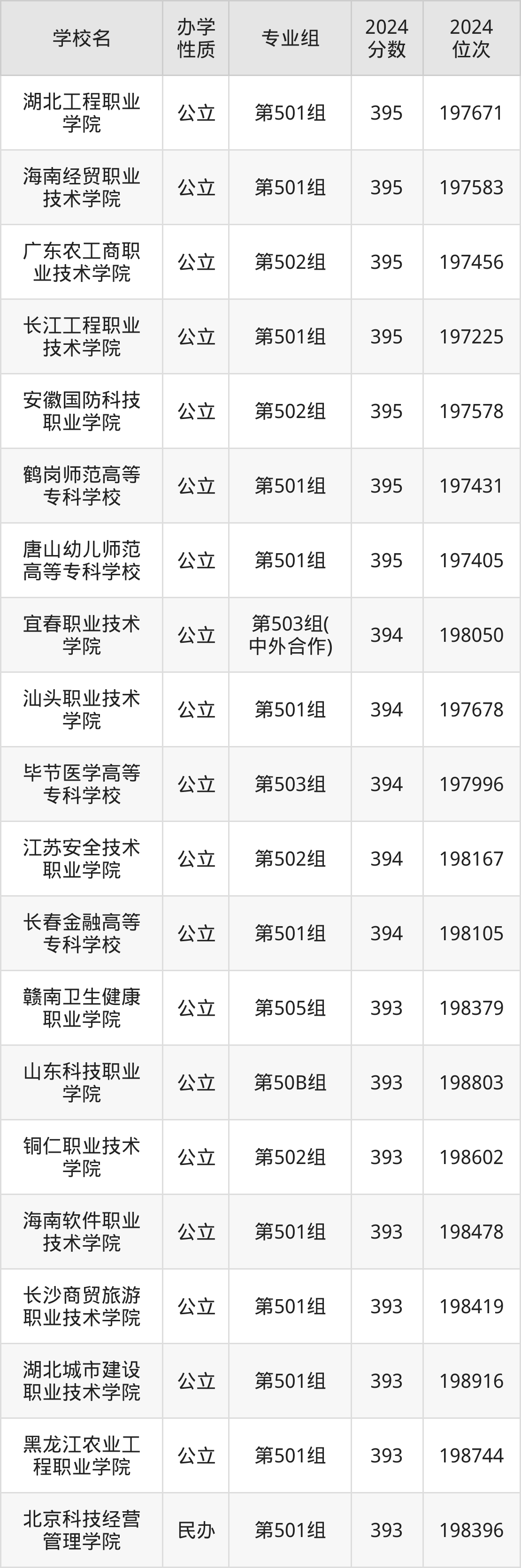 | 长春金融高等 专科学校 | 第501组 | 394 | 198105 |