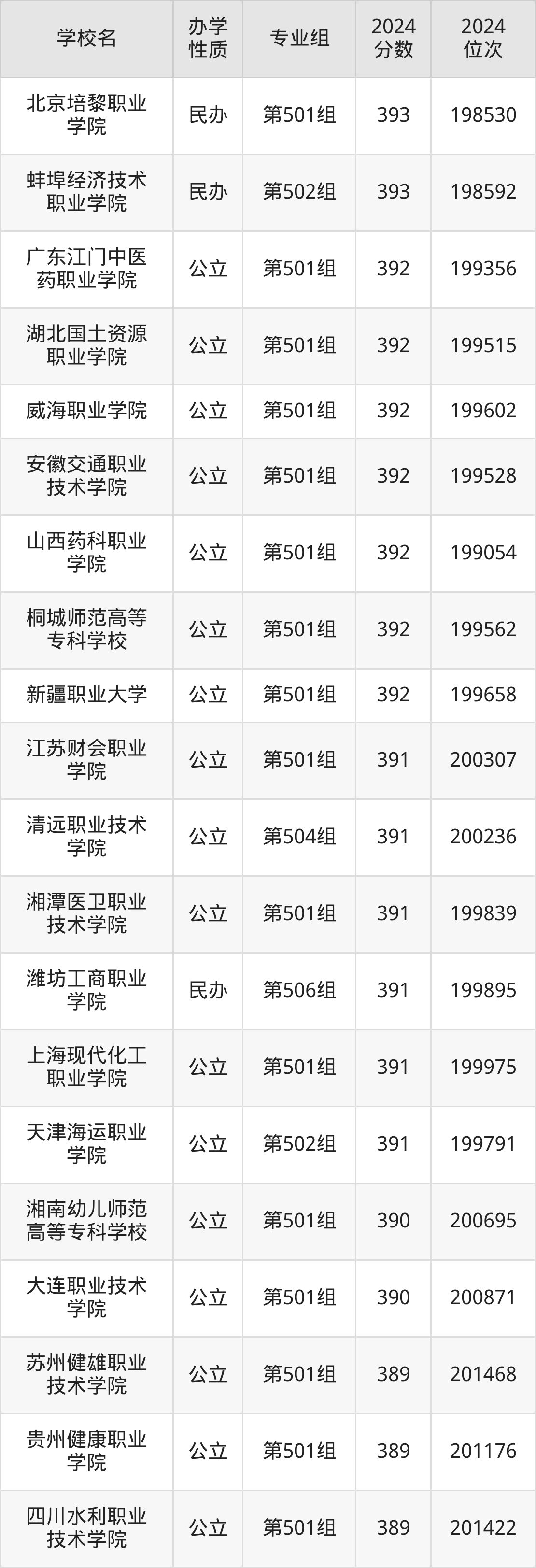 | 安徽卫生健康 职业学院 | 第501组 | 386 | 203150 |