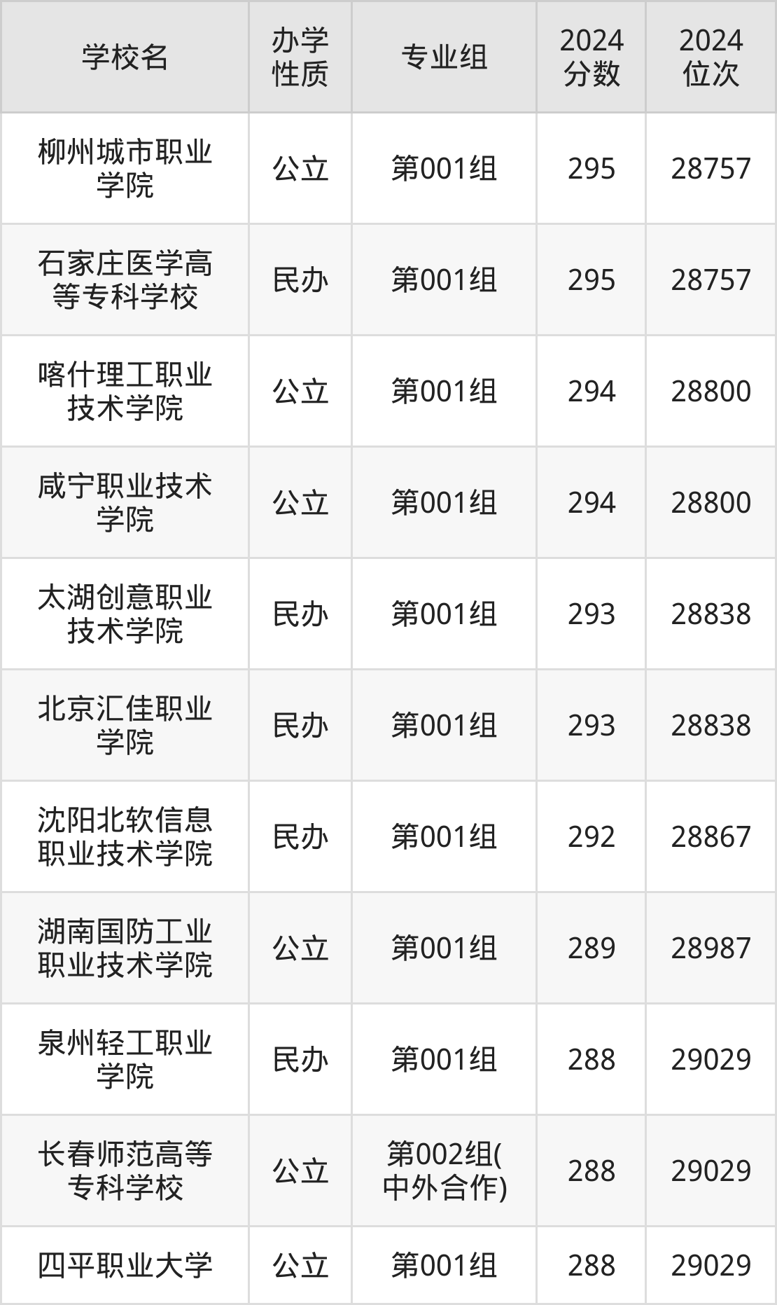 2024年吉林历史类293分考生能上柳州城市职业学院、石家庄医学高等专科学校、喀什理工职业技术学院、咸宁职业技术学院、太湖创意职业技术学院等10所专科院校,具体录取分数线及位次为: