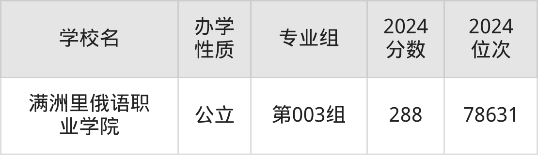 | 满洲里俄语职 业学院 | 第003组 | 288 | 78631 |