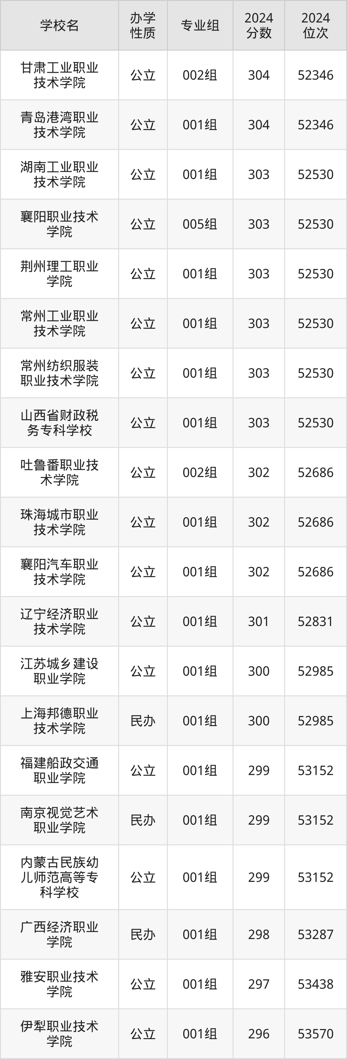 2024年甘肃历史类299分考生能上甘肃工业职业技术学院、青岛港湾职业技术学院、湖南工业职业技术学院、襄阳职业技术学院、荆州理工职业学院等30所专科院校,具体录取分数线及位次为: