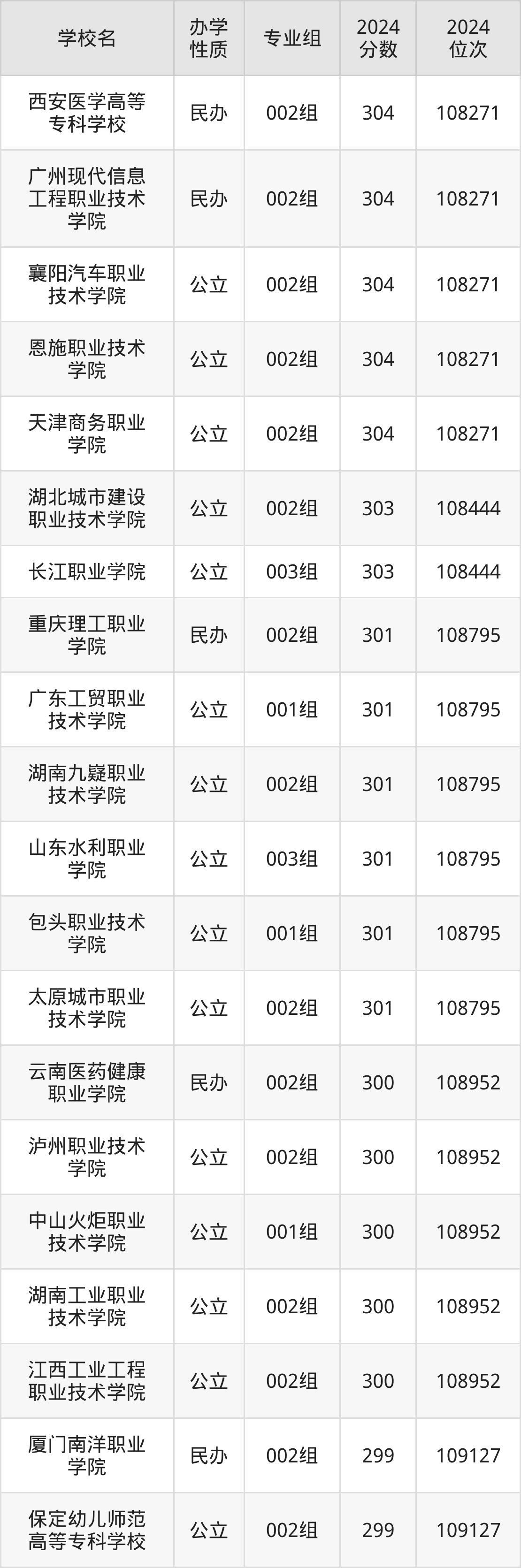 2024年甘肃物理类299分考生能上西安医学高等专科学校、广州现代信息工程职业技术学院、襄阳汽车职业技术学院、恩施职业技术学院、天津商务职业学院等52所专科院校,具体录取分数线及位次为: