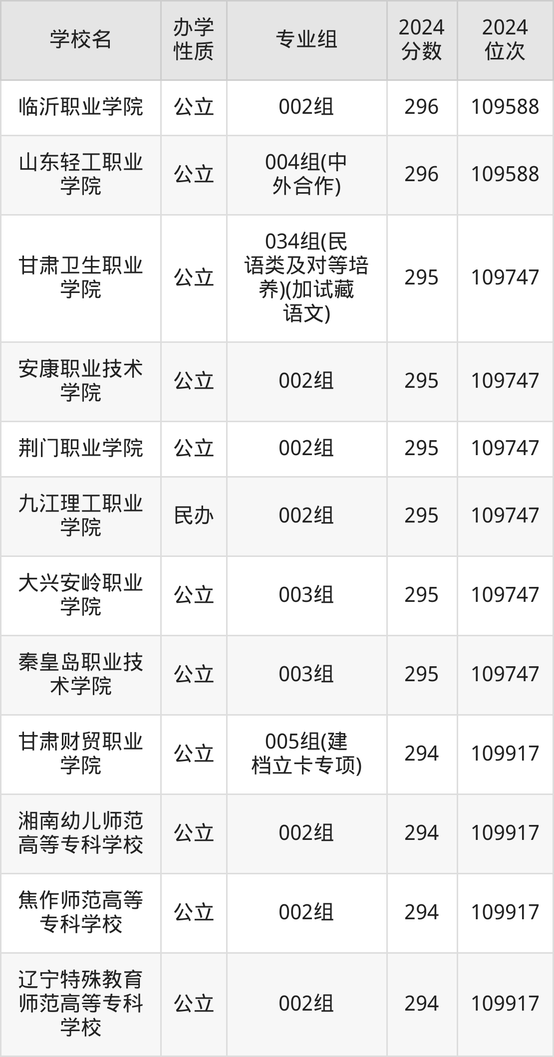 | 甘肃卫生职业 学院 | 034组(民 语类及对等培 养)(加试藏 语文) | 295 | 109747 |