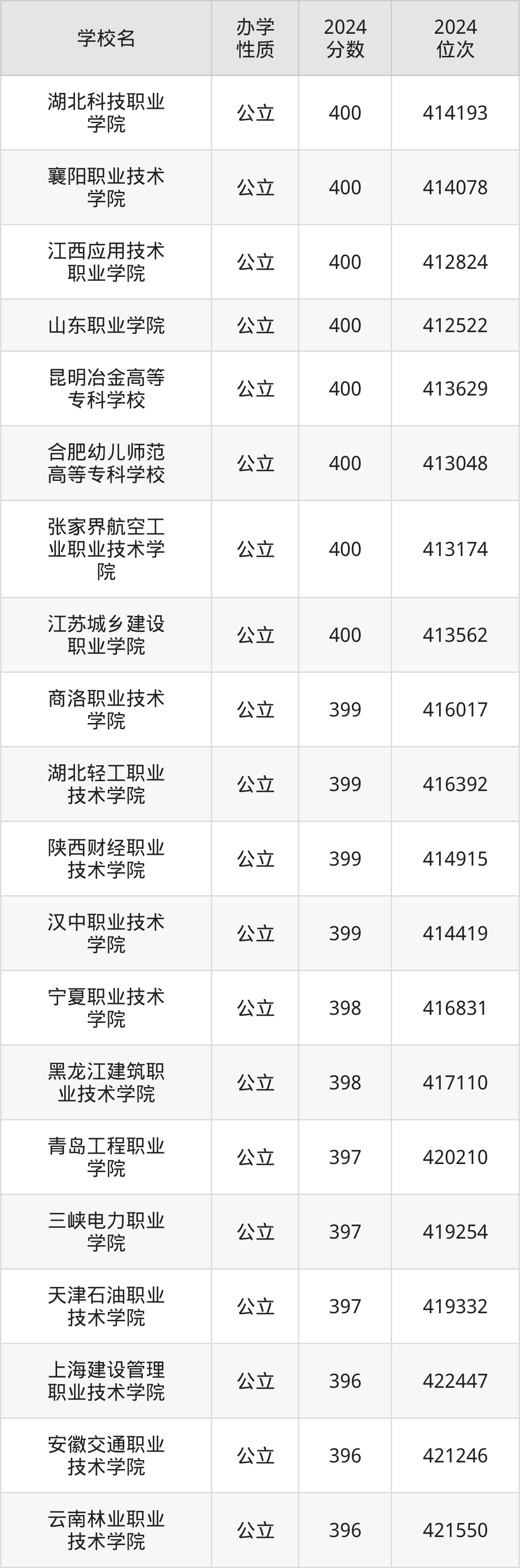 | 湖北科技职业 学院 | 400 | 414193 |