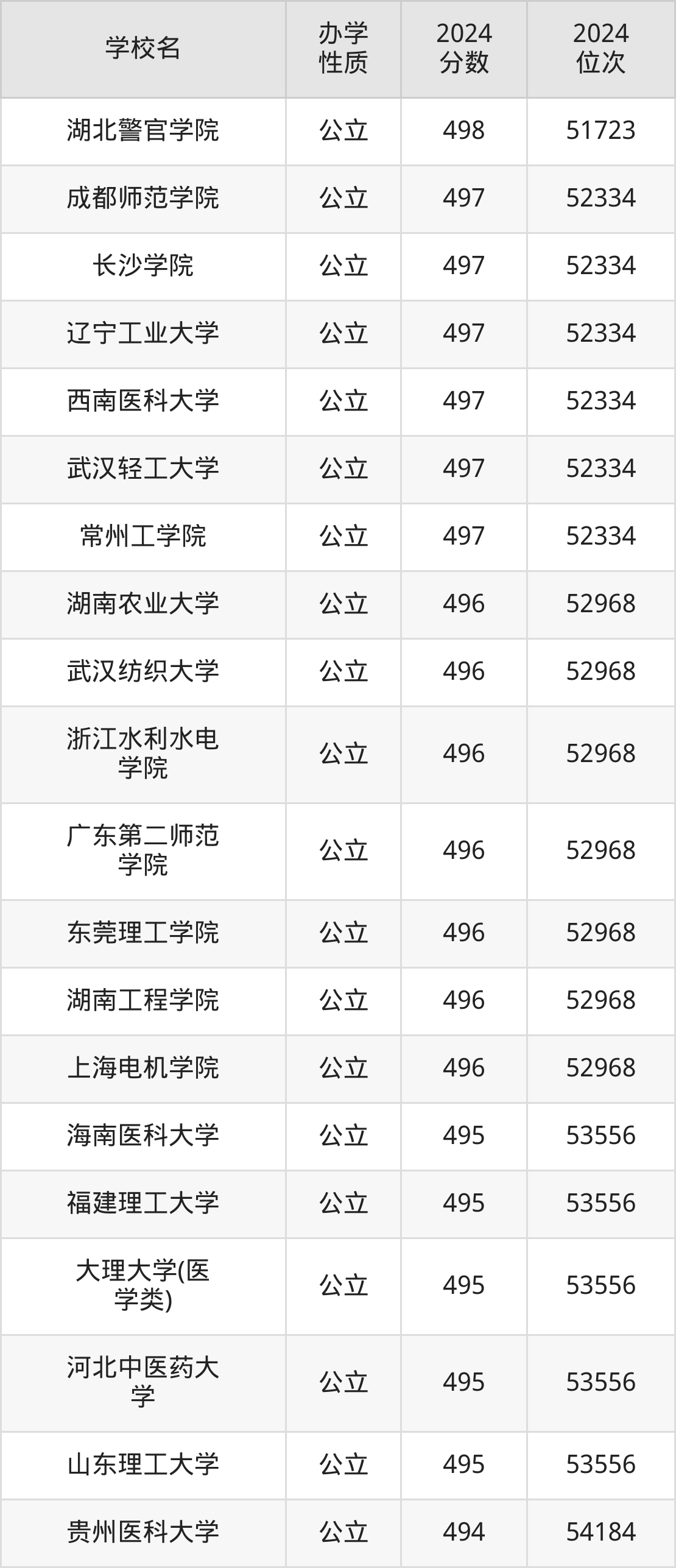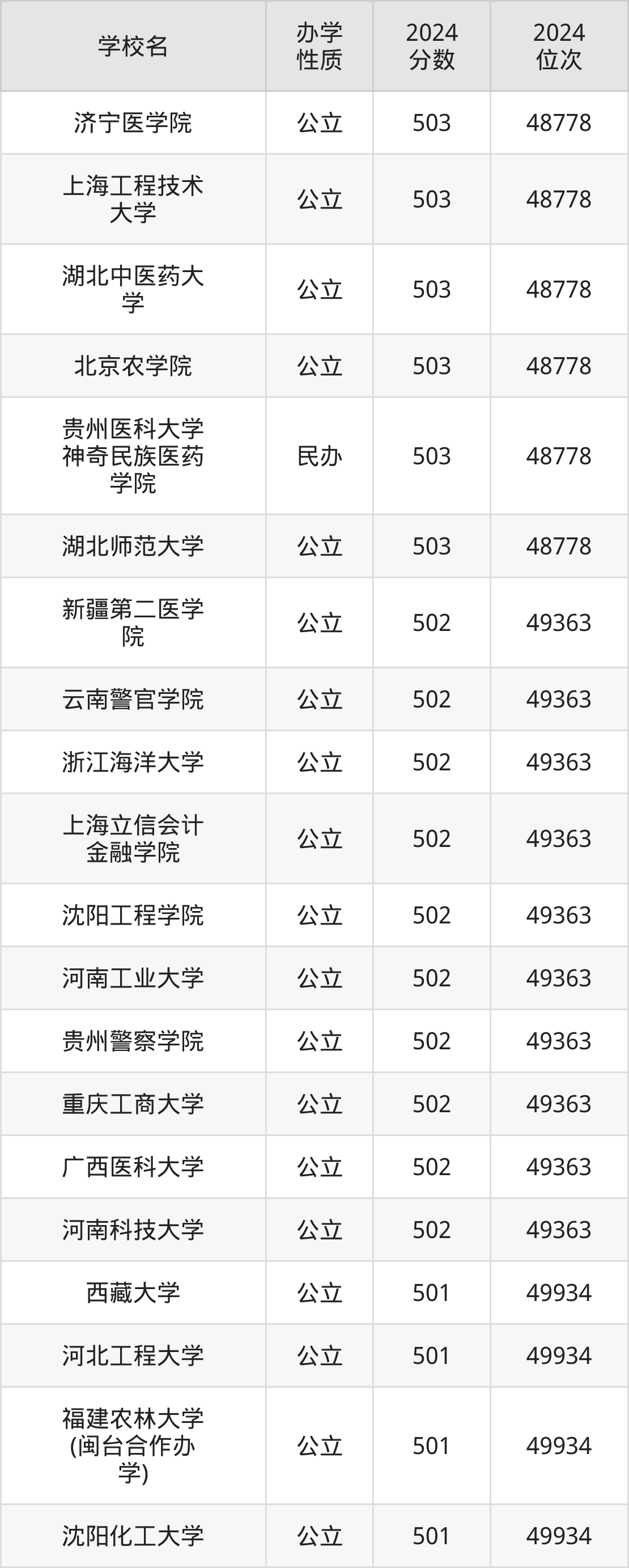 2024年云南理科498分考生能上济宁医学院、上海工程技术大学、湖北中医药大学、北京农学院、贵州医科大学神奇民族医药学院等76所二本院校,具体录取分数线及位次为: