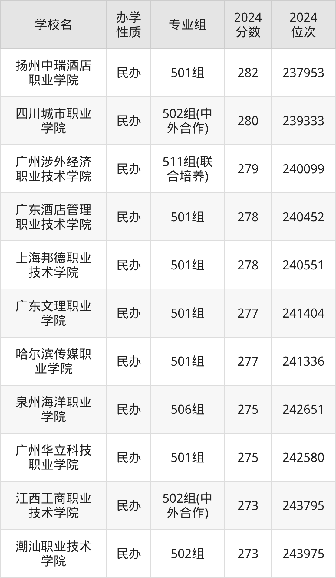 2024年广东历史类277分考生能上扬州中瑞酒店职业学院、四川城市职业学院、广州涉外经济职业技术学院、广东酒店管理职业技术学院、上海邦德职业技术学院等11所专科院校,具体录取分数线及位次为: