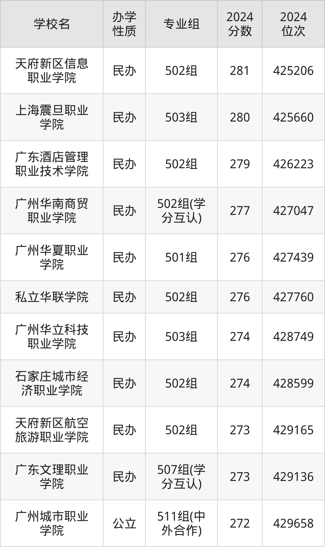 2024年广东物理类277分考生能上天府新区信息职业学院、上海震旦职业学院、广东酒店管理职业技术学院、广州华南商贸职业学院、广州华夏职业学院等11所专科院校,具体录取分数线及位次为: