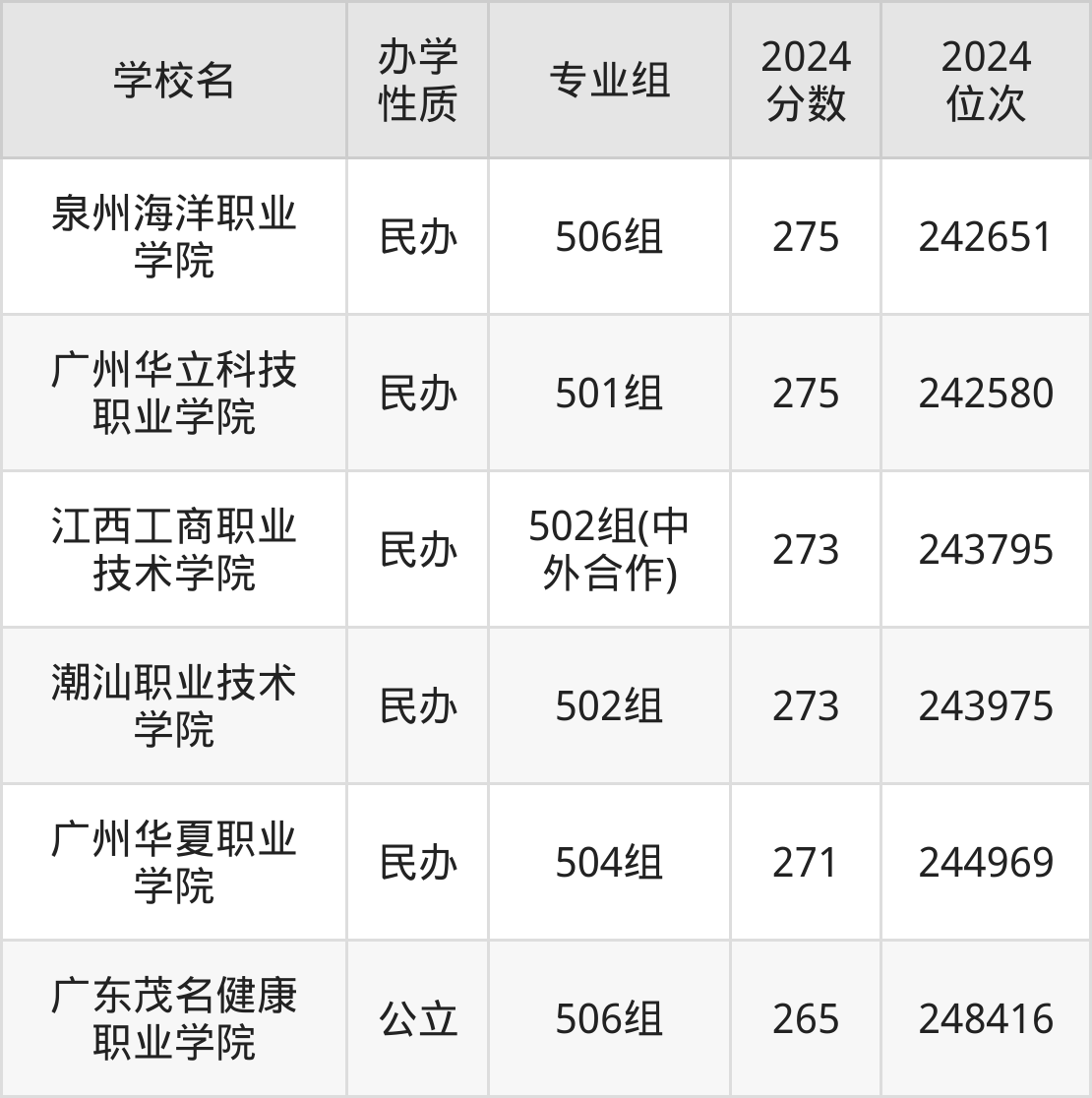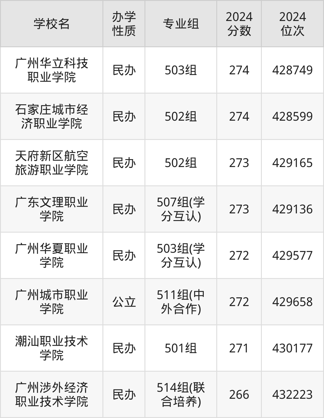 2024年广东物理类270分考生能上广州华立科技职业学院、石家庄城市经济职业学院、天府新区航空旅游职业学院、广东文理职业学院、广州华夏职业学院等8所专科院校,具体录取分数线及位次为: