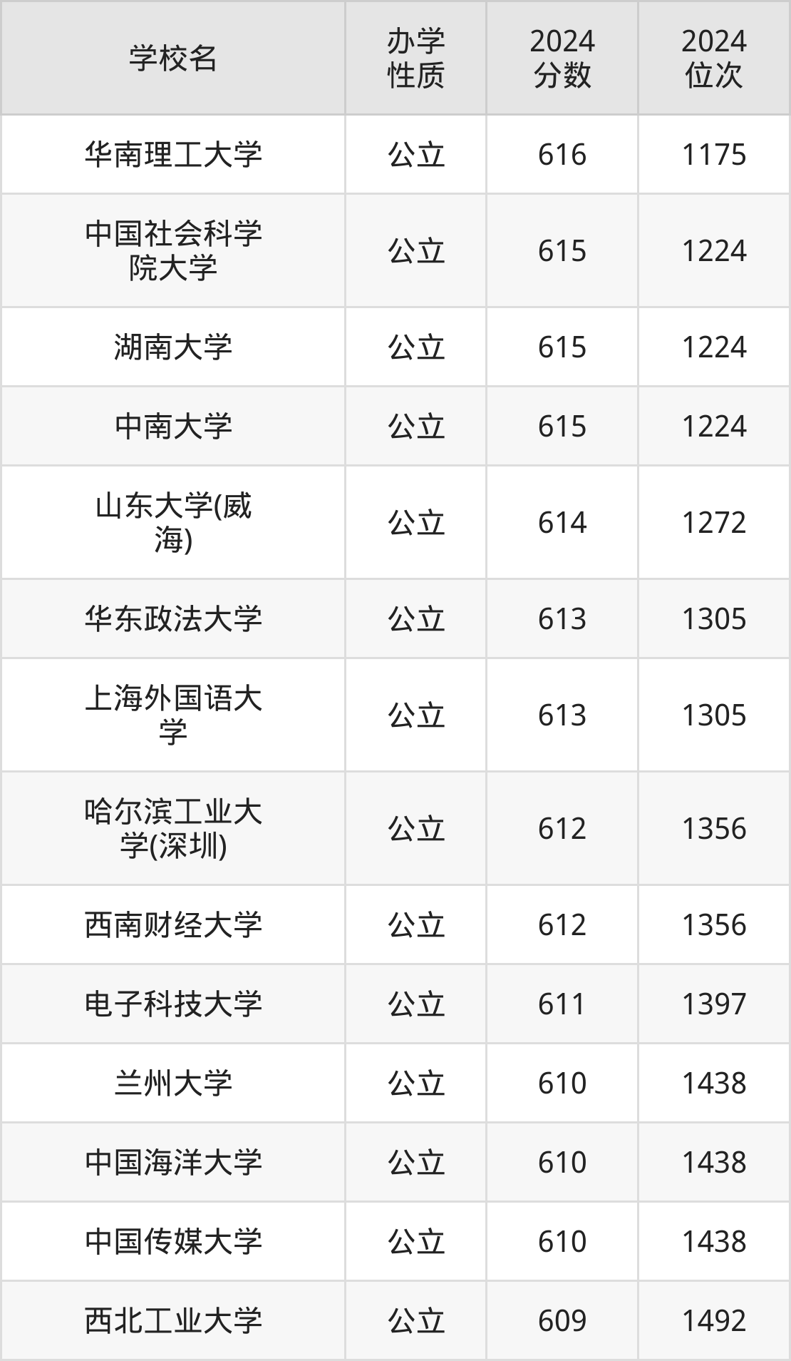 辽宁612分左右的考生可以上华南理工大学、中国社会科学院大学、湖南大学等院校,刚好在612分的院校有哈尔滨工业大学(深圳)、西南财经大学。