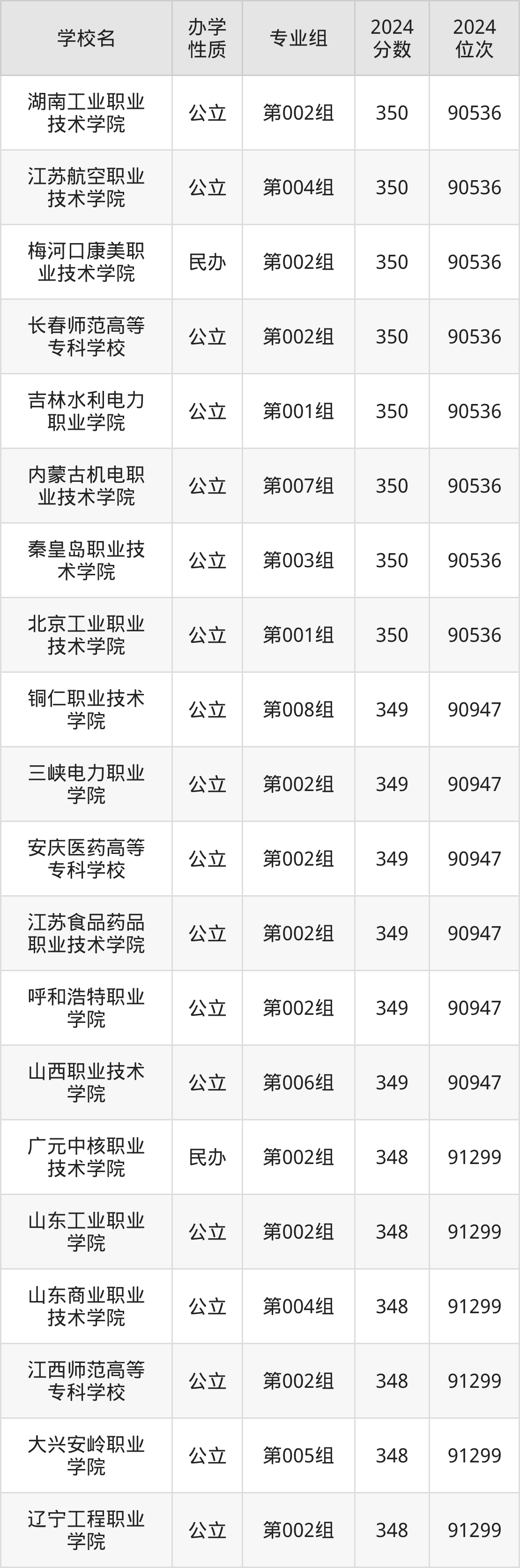 | 吉林水利电力 职业学院 | 第001组 | 350 | 90536 |