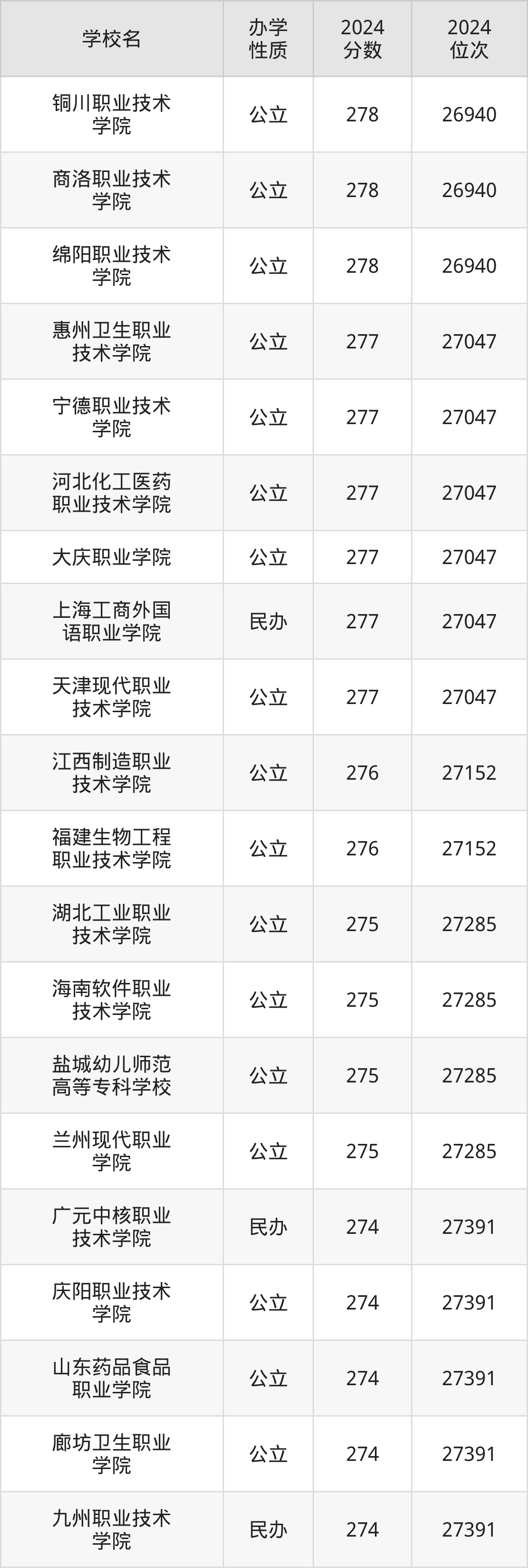2024年青海理科273分考生能上铜川职业技术学院、商洛职业技术学院、绵阳职业技术学院、惠州卫生职业技术学院、宁德职业技术学院等51所专科院校,具体录取分数线及位次为: