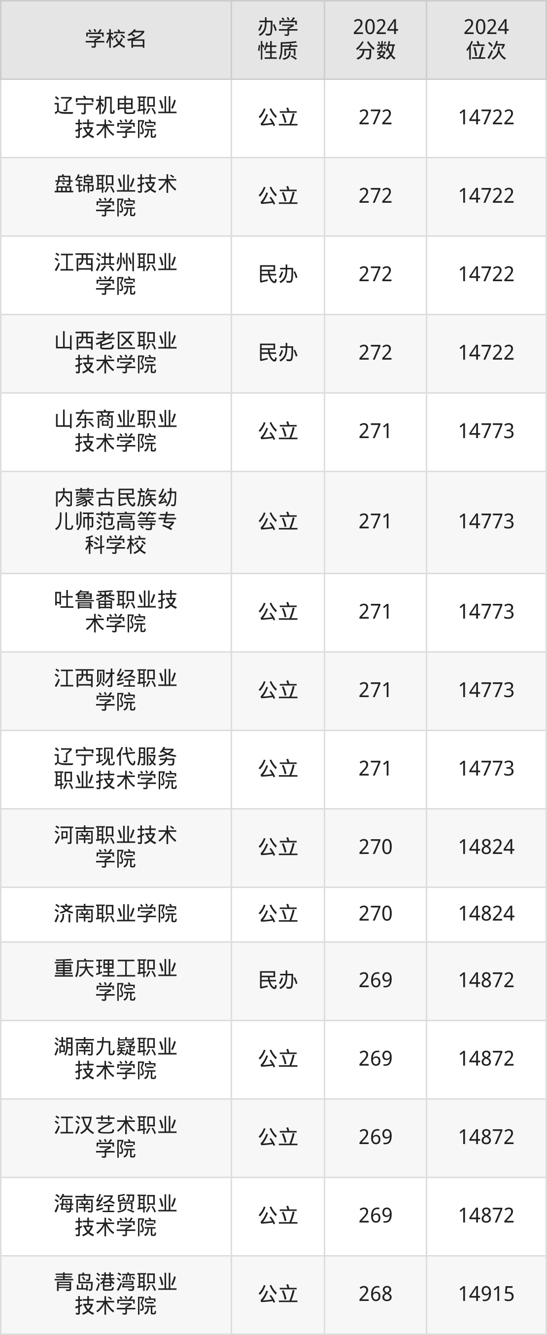 | 辽阳职业技术 学院 | 271 | 27685 |