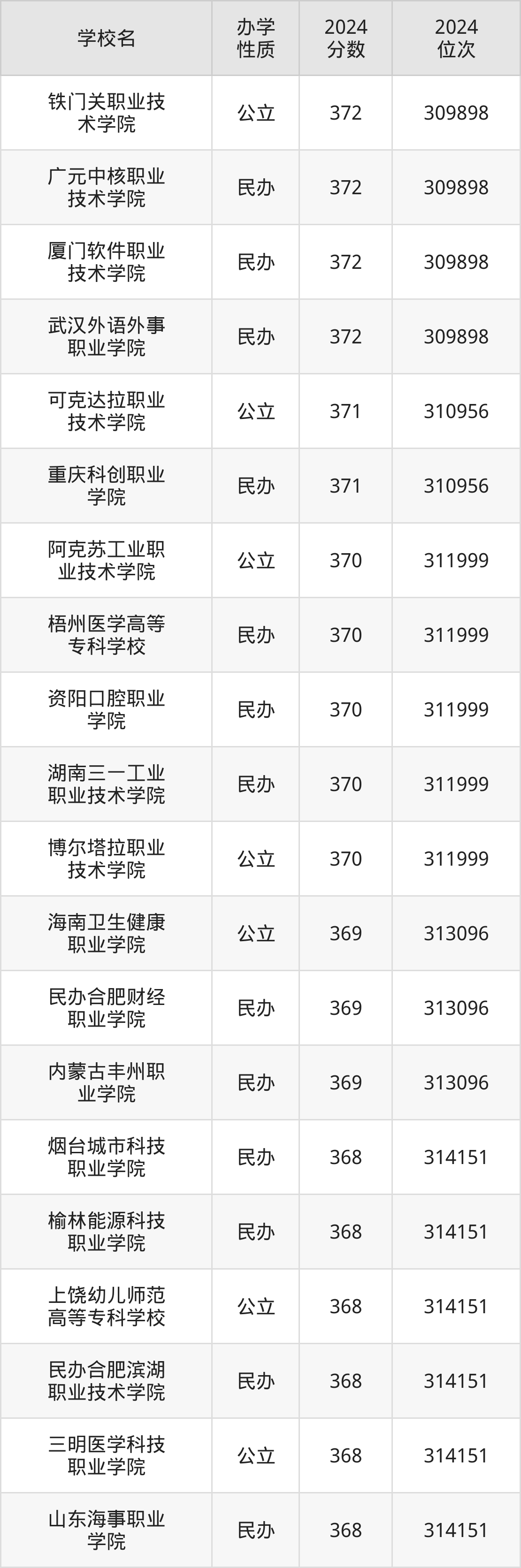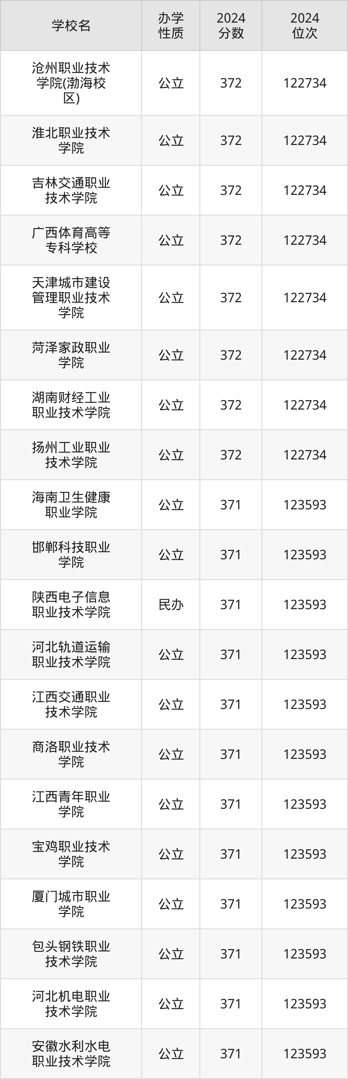 | 安徽水利水电 职业技术学院 | 371 | 123593 |