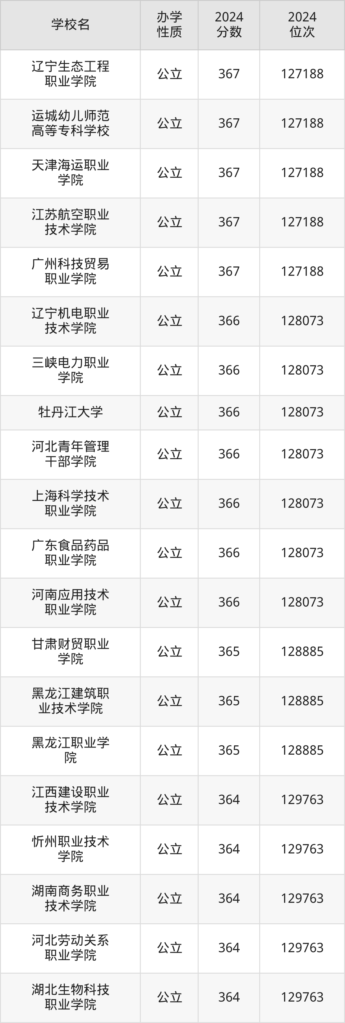 2024年河北物理类367分考生能上铁门关职业技术学院、广元中核职业技术学院、厦门软件职业技术学院、武汉外语外事职业学院、可克达拉职业技术学院等48所专科院校,具体录取分数线及位次为: