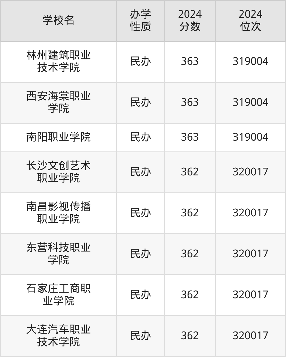 | 长沙文创艺术 职业学院 | 362 | 320017 |