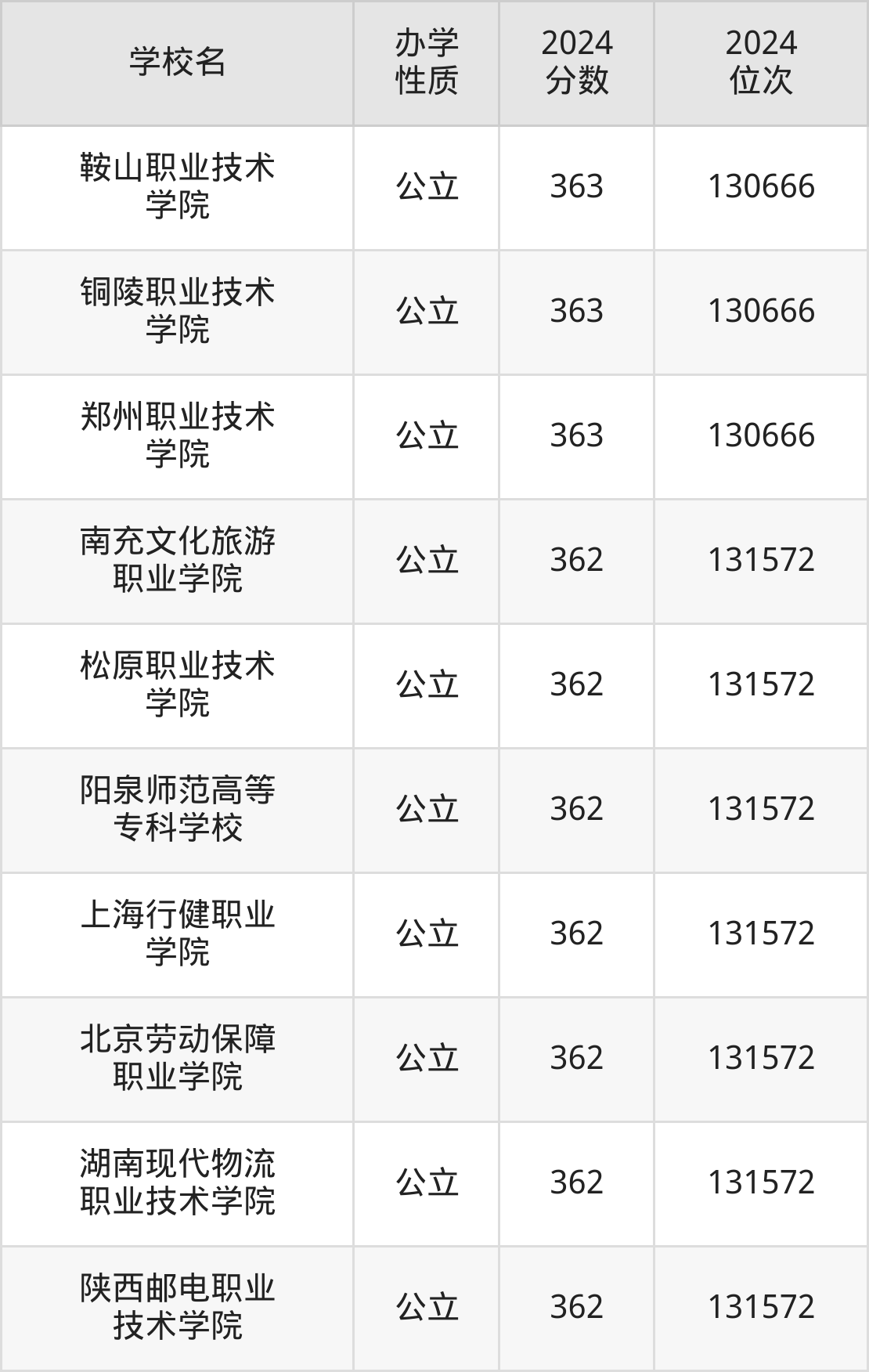 | 铜陵职业技术 学院 | 363 | 130666 |