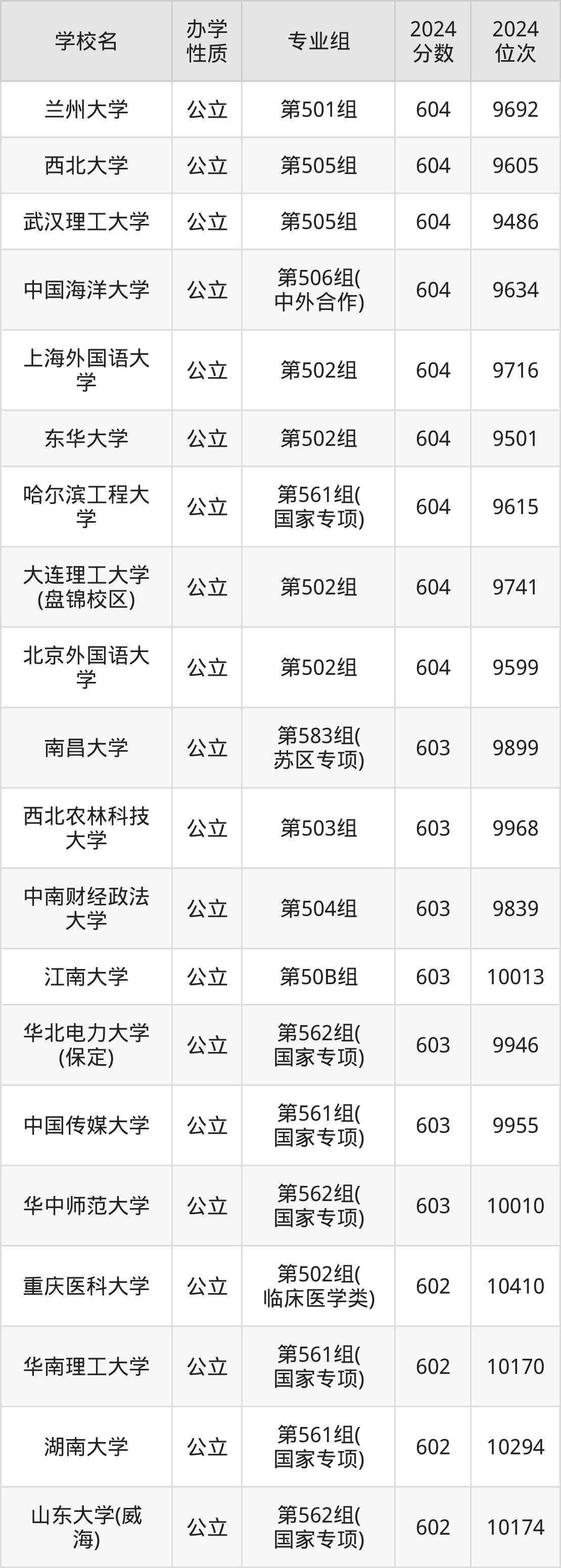 2024年江西物理类599分考生能上兰州大学、中国海洋大学、大连理工大学(盘锦校区)、西北农林科技大学、华南理工大学等16所985院校,具体录取分数线及位次为: