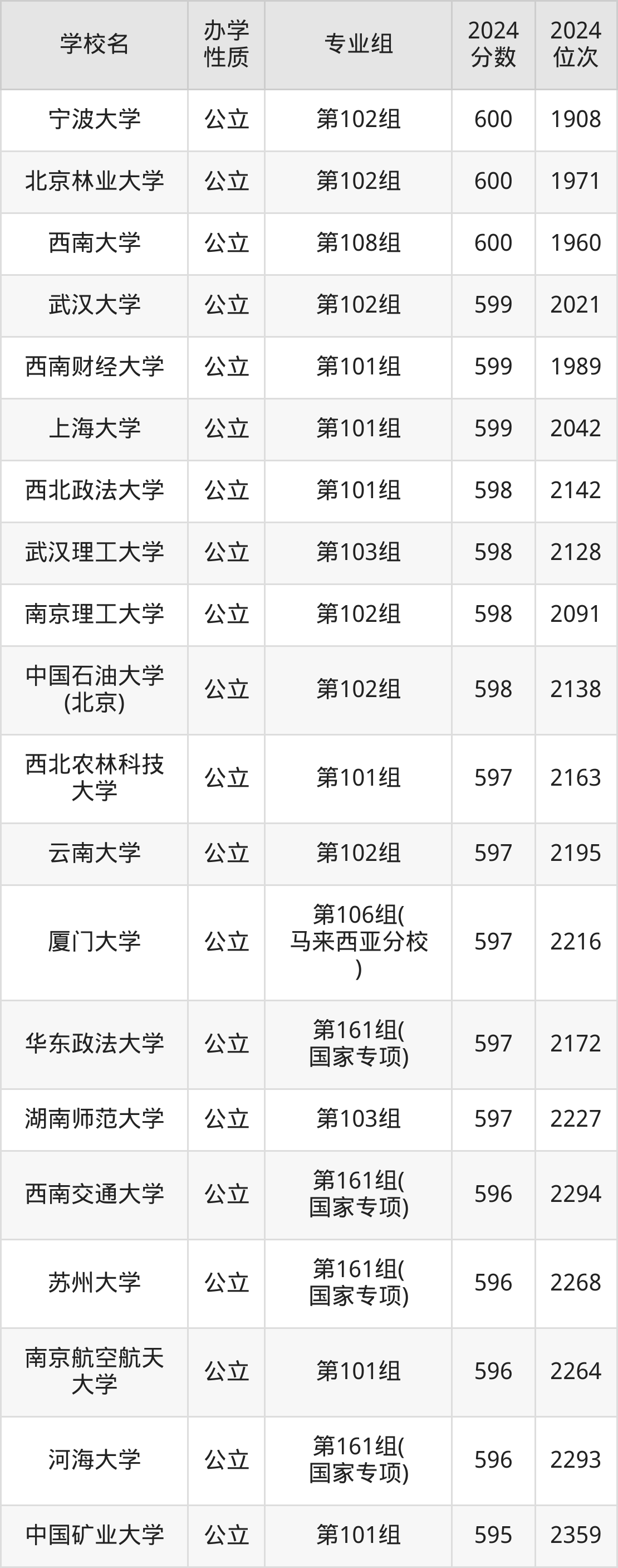 2024年江西历史类599分考生能上厦门大学、西北农林科技大学、武汉大学、山东大学(威海)、中国农业大学等8所985院校,具体录取分数线及位次为: