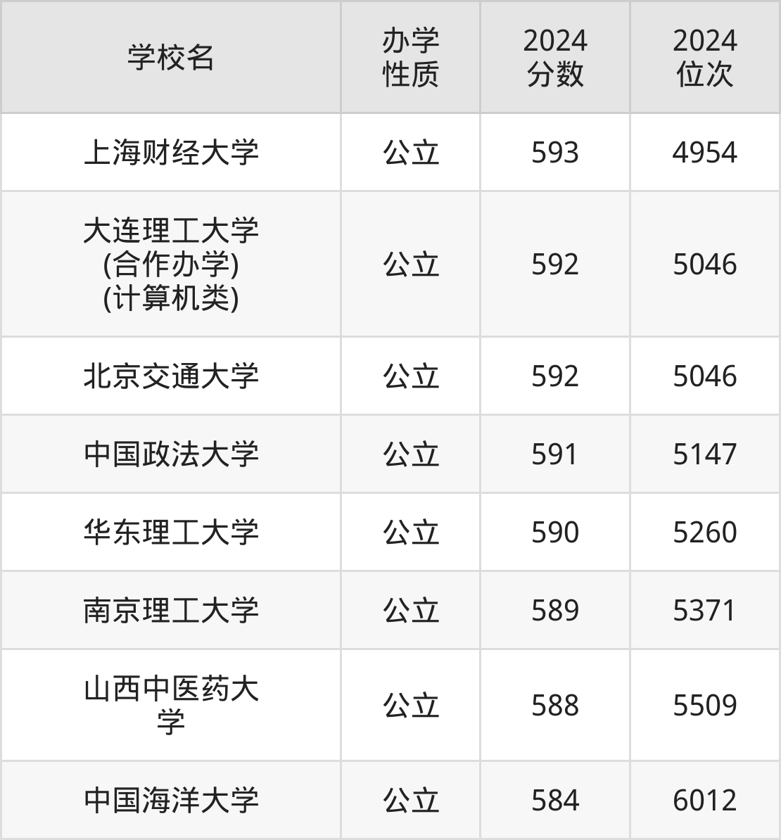 内蒙古588分左右的考生可以上上海财经大学、大连理工大学(合作办学)(计算机类)、北京交通大学等院校,刚好在588分的院校有山西中医药大学。