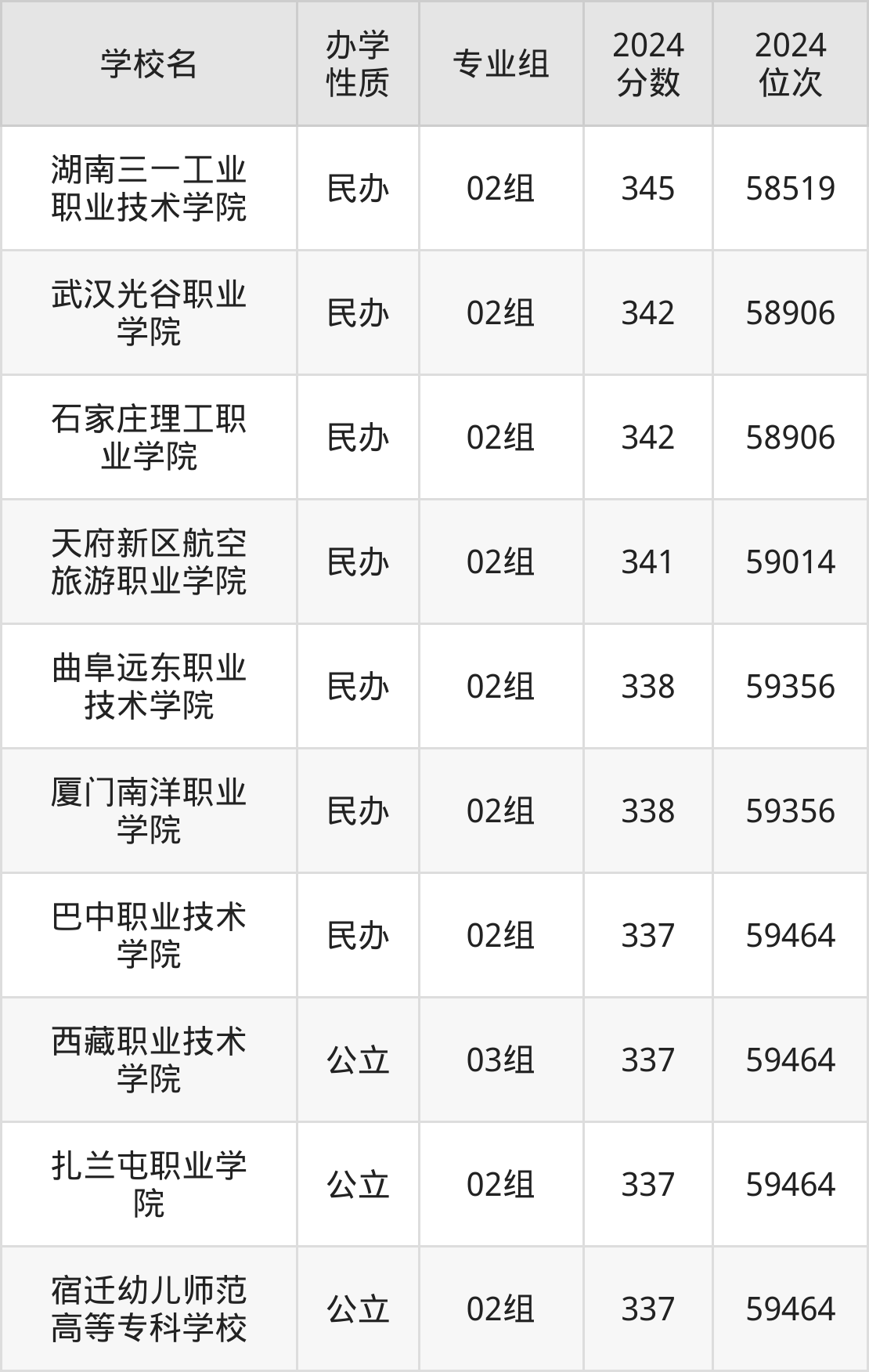 2024年江苏物理类341分考生能上湖南三一工业职业技术学院、武汉光谷职业学院、石家庄理工职业学院、天府新区航空旅游职业学院、曲阜远东职业技术学院等10所专科院校,具体录取分数线及位次为: