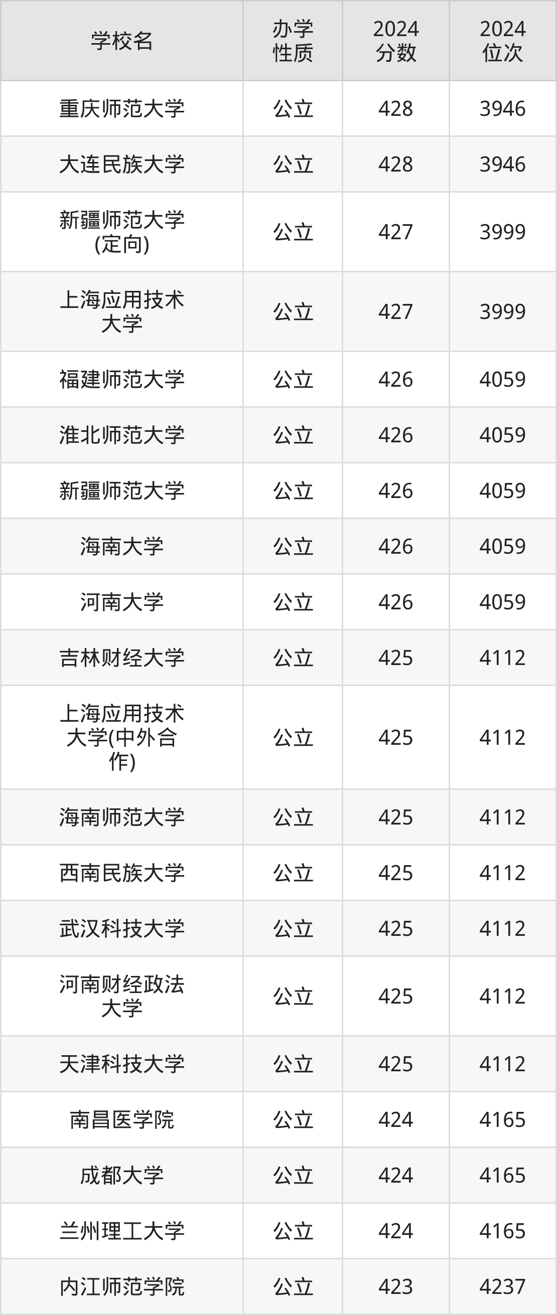 2024年新疆文科423分考生能上重庆师范大学、福建师范大学、淮北师范大学、吉林财经大学、南昌医学院等25所二本院校,具体录取分数线及位次为: