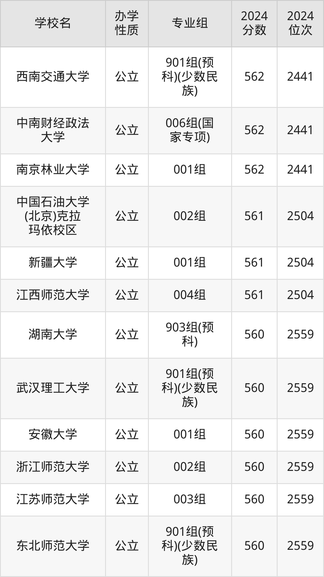 | 西南交通大学 | 901组(预 科)(少数民 族) | 562 | 2441 |